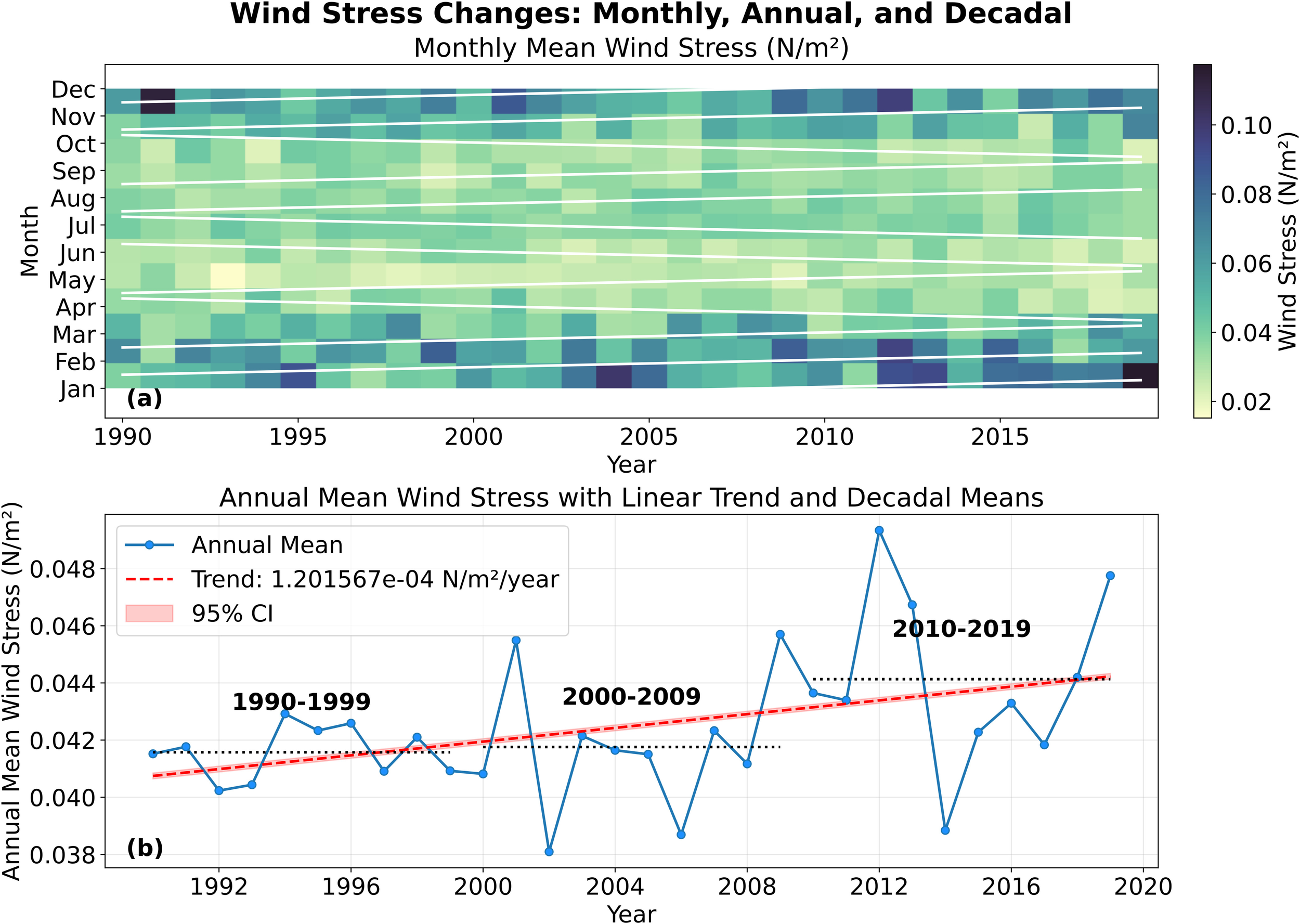The annual mean wind stress time series (Figure 5b) exhibits pronounced interannual variability, with values fluctuating between roughly 0.038 and 0.048 N m-2 over the 30-year record. The decadal averages reveal distinct shifts in wind forcing regimes: from 1990–1999, values cluster near 0.040 N m-2; during 2000–2009, a modest increase is evident, with means rising toward 0.041–0.042 N m-2; and from 2010–2019, annual means frequently exceed 0.044 N m-2, marking the highest decade in the record.