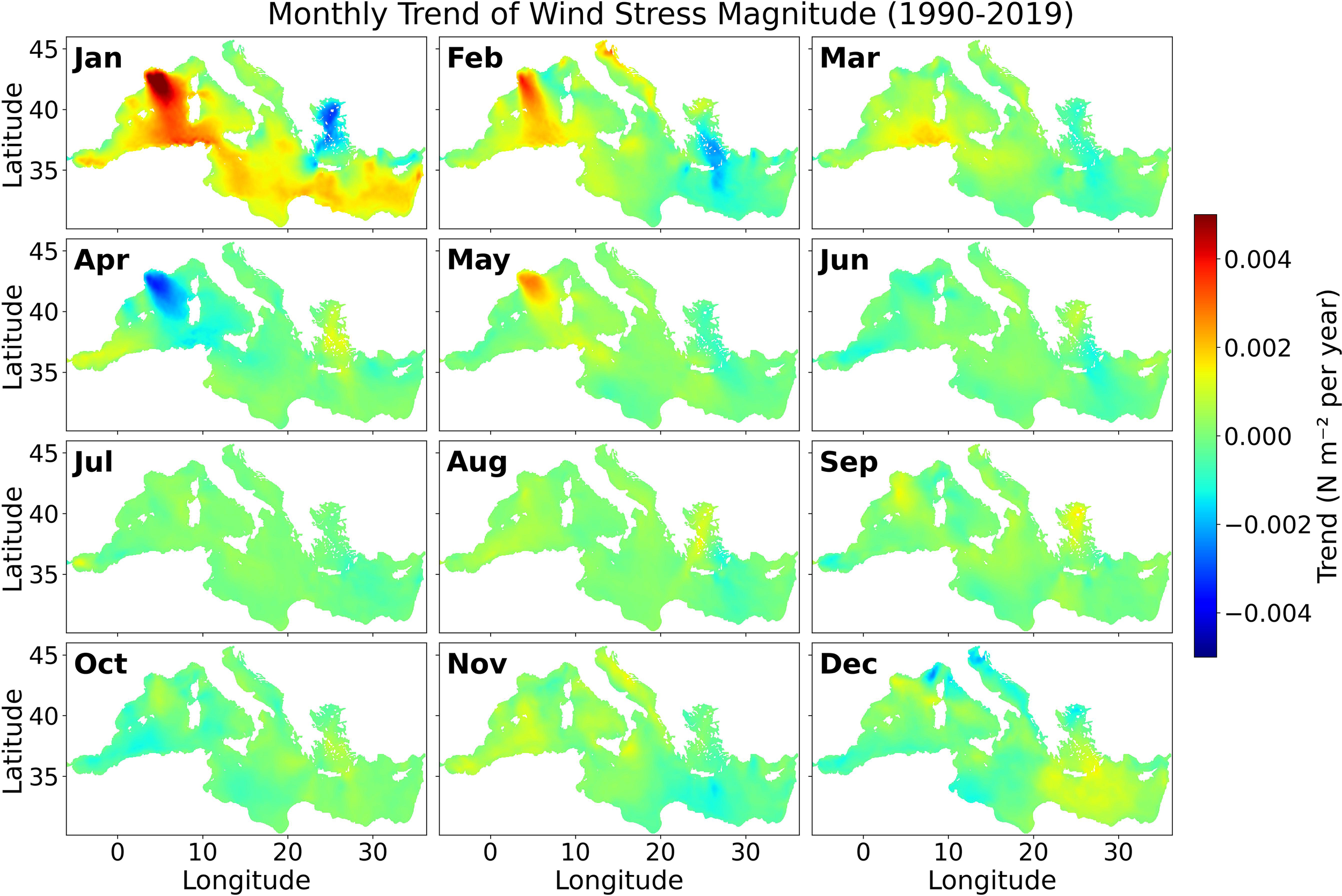 Monthly trends of wind stress magnitude (N·m-2·year-1) over the period 1990–2019. Each panel shows the linear trend for a specific month at each grid point. Positive values indicate an increasing trend, while negative values indicate a decreasing trend.