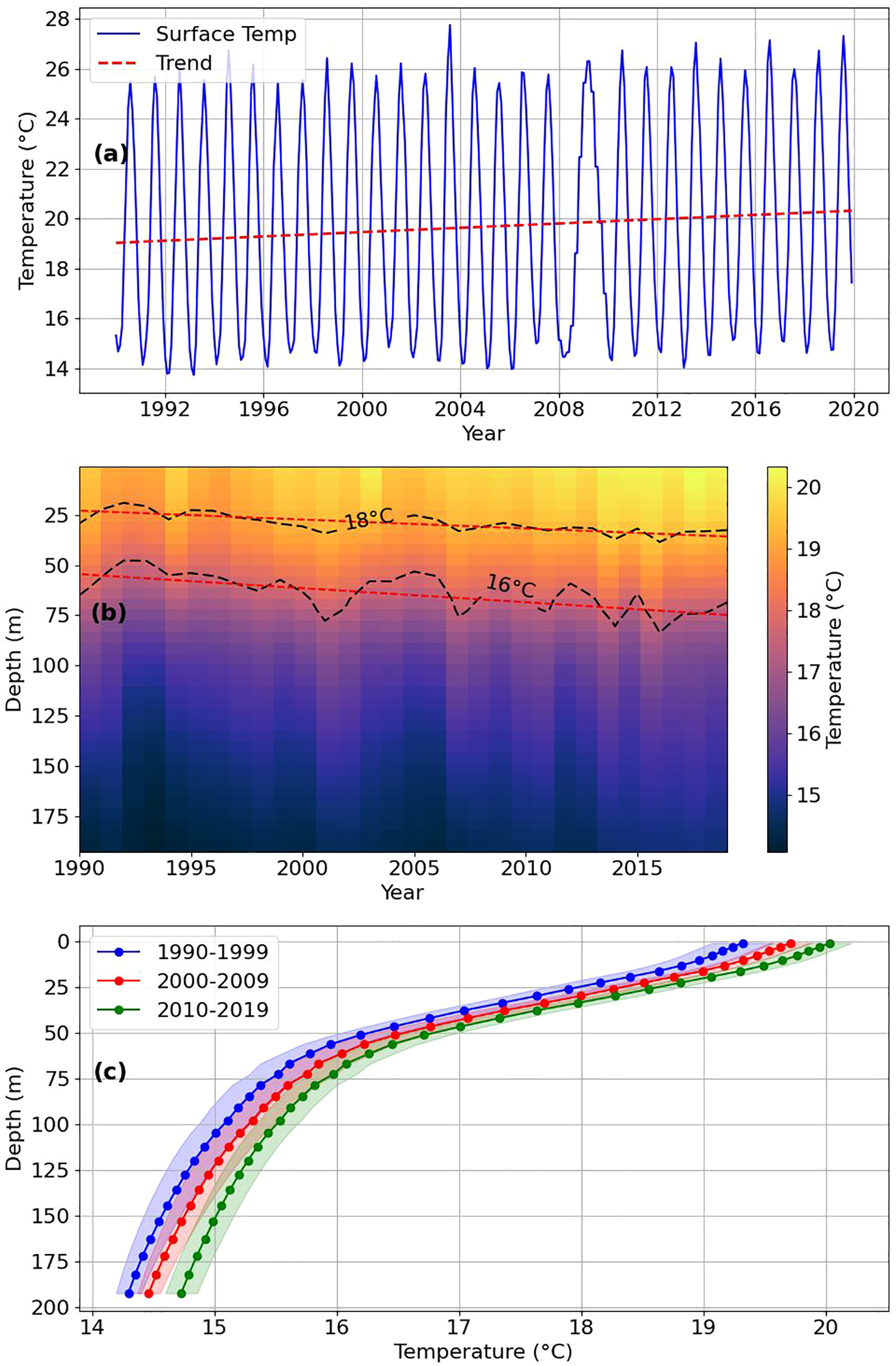 (a) Monthly surface temperature time series (°C) with its linear trend (red dashed line). (b) Yearly temperature profiles at different depths, visualized as a heatmap with contour lines at 16°C and 18°C. Red dashed lines indicate linear trends of these contour levels over time. (c) Decadal mean temperature depth profiles for 1990–1999, 2000–2009, and 2010–2019. Shaded areas represent standard deviation.