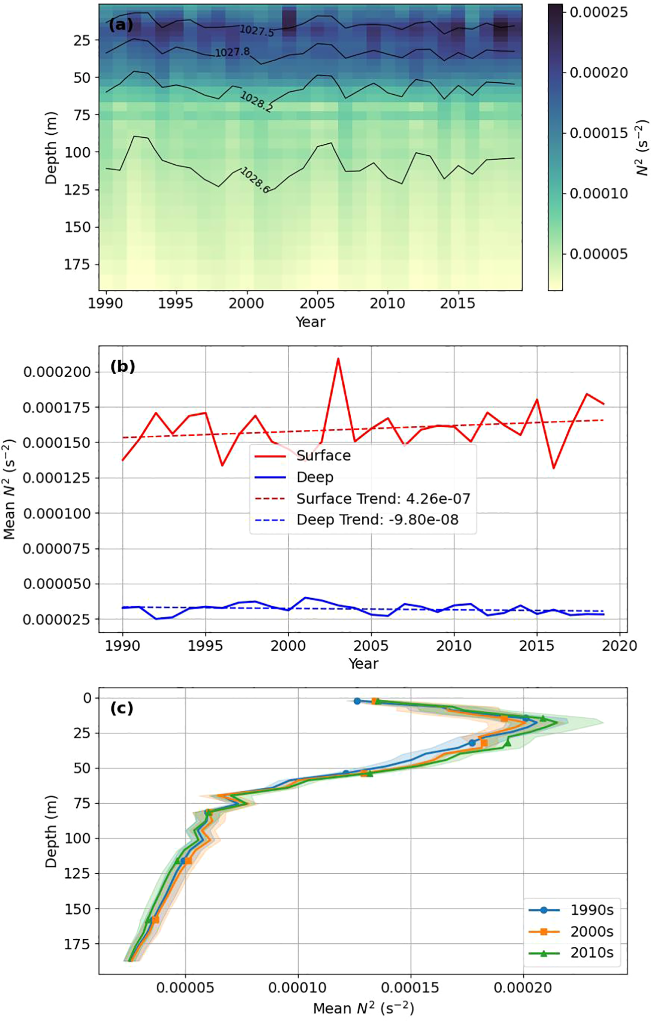 The combined effects of wind-driven mixing, surface heating, and salinity changes are reflected in the stratification of the water column, here quantified (Equation 2) by the Brunt–Väisälä frequency (N2), defined as