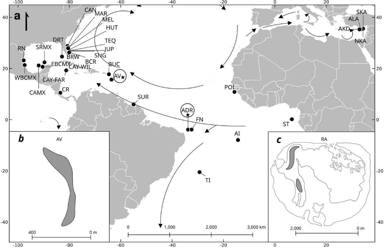 Location of rookeries (circles) and the two courtship and mating sites (stars) of Chelonia mydas in the Caribbean, Atlantic and Mediterranean, where haplotype frequencies for a fragment ~800bp of control mtDNA were estimated in this study and other publications (see Supplementary Table S1). Arrows indicate primary ocean currents (Naro-Maciel 2012). Rookeries included: a) Matapica, Suriname, SUR; Tortuguero, Costa Rica, CR; Ascension Island, United Kingdom, AI; Buck Island, USA, BUC; Tamaulipas and Veracruz, Mexico, WBCMX; Campeche and Yucatán, Mexico, EBCMX; Cayo Arcas, Campeche, Mexico, CAMX; Scorpion Reef, Yucatán, Mexico, SRMX; Rancho Nuevo, Mexico, RN; Sao Tome, ST; Canaveral National Seashore, USA, CAN; Melbourne Beach, USA, MEL; southern Hutchinson Island, USA, HUT; northern Jupiter Island, USA, JUP; Tequesta, southern Jupiter Island, USA, TEQ; Singer Island, USA, SNG; Boca Raton, USA, BCR; Hillsboro, USA, BRW; Dry Tortugas National Park, USA, DRT; Trindade Island, Brazil (TI); Fernando de Noronha, Brazil, (FN), Poilao, Guinea Bissau, (POI), South Karpaz, (SKA), Alagadi, (ALA), North Karpaz (NKA), Akdeniz, Cyprus, (AKD) Cayman Island, Wild (CAY-WIL) and Cayman Island Farm, CAY-FAR. Location of focal nesting, courtship and mating sites (stars), b) Isla de Aves (AV), Venezuela and c) Atol das Rocas (ADR), Brazil.