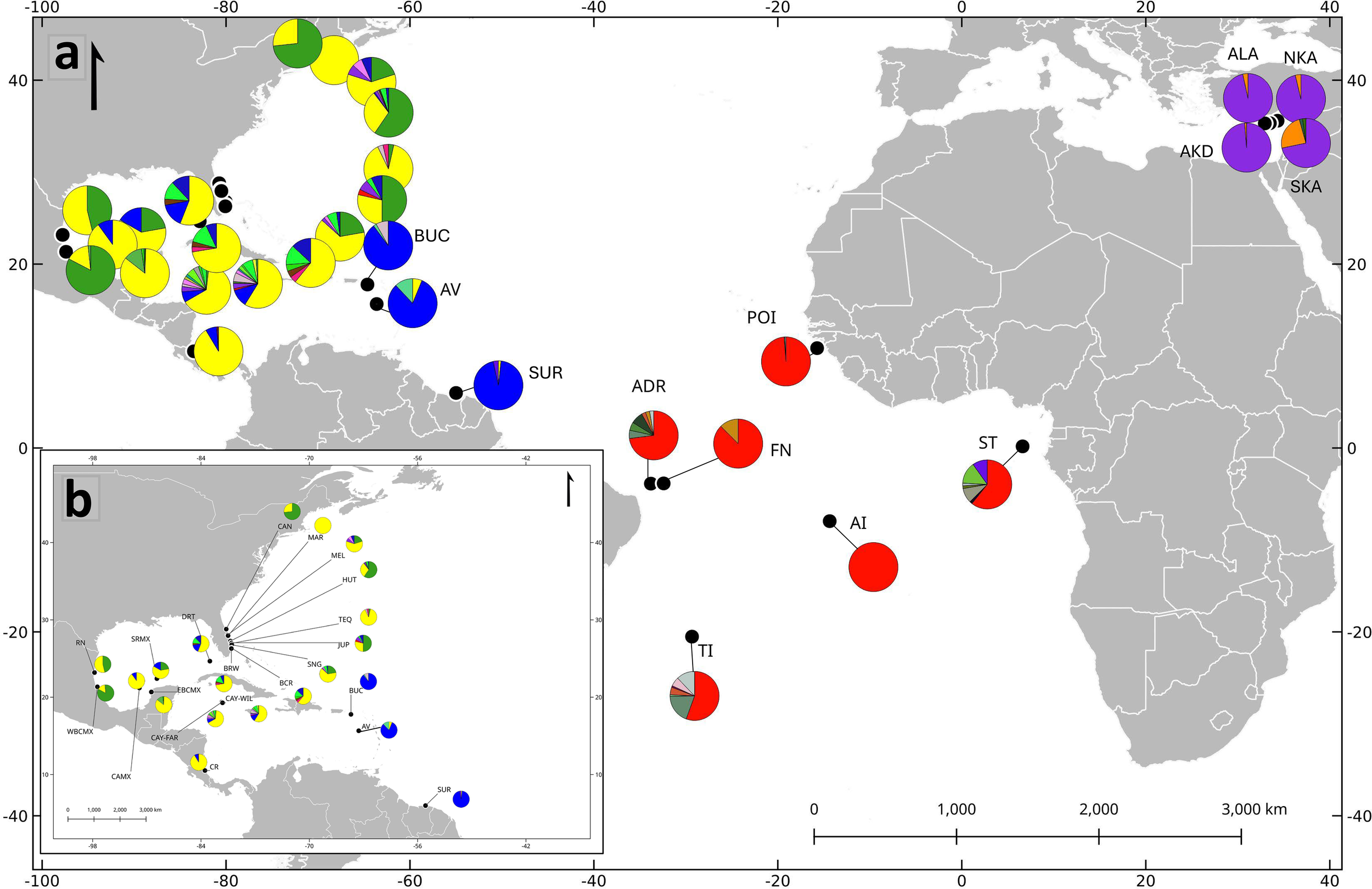 Frequency of haplotypes in an ~800 bp mtDNA fragment of the control region, estimated in the current study for two field sites (Isla de Aves, AV, and Atol das Rocas, ADR), in the context of 31 rookeries in the Caribbean, Atlantic, and Mediterranean. (a) Distribution of the four dominant haplotype groups, as defined by AMOVA, FST, and PCoA analysis (see text), indicated by colors as follows: Yellow (CM-A3.1) represents group 1, in the Gulf of Mexico and western Caribbean; Blue (CM-A5.1) represents group 2, in the southeastern Caribbean; Red (CM-A8.1) represents group 3 in the western Atlantic; and purple (CM-A13.1) represents group 4 in the Mediterranean Sea. (b) Detailed distribution of haplotype groups 1 and 2 in the Gulf of Mexico, western and southeastern Caribbean.