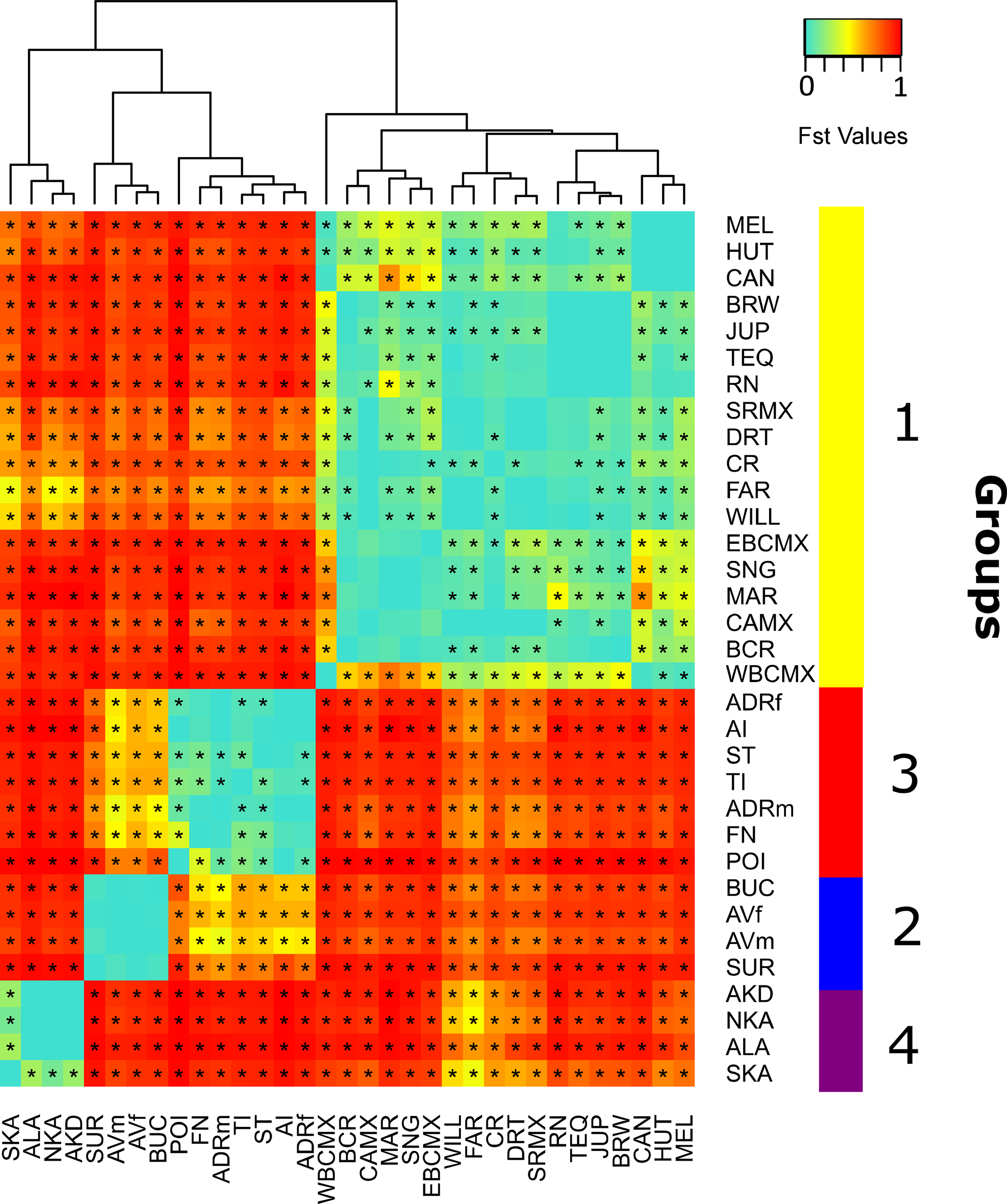 Heatmap of FST values among all 31 nesting and 2 courtship/mating sites of C. mydas in the Caribbean, western Atlantic, and Mediterranean, listed in order of relationship based on the FST values shown at the top of the heatmap. The geographic location of each of the identified regional groups is plotted on the y axis at the right side of the heatmap. The four major groups were: the Gulf of Mexico and western Caribbean (yellow; group 1), eastern Caribbean (blue; group 2), western Atlantic (red; group 3) and Mediterranean Sea (purple, group 4). Abbreviations of nesting and courtship/mating sites are as described in Figures 1, 2. FST values significantly above zero are indicated with an asterisk.