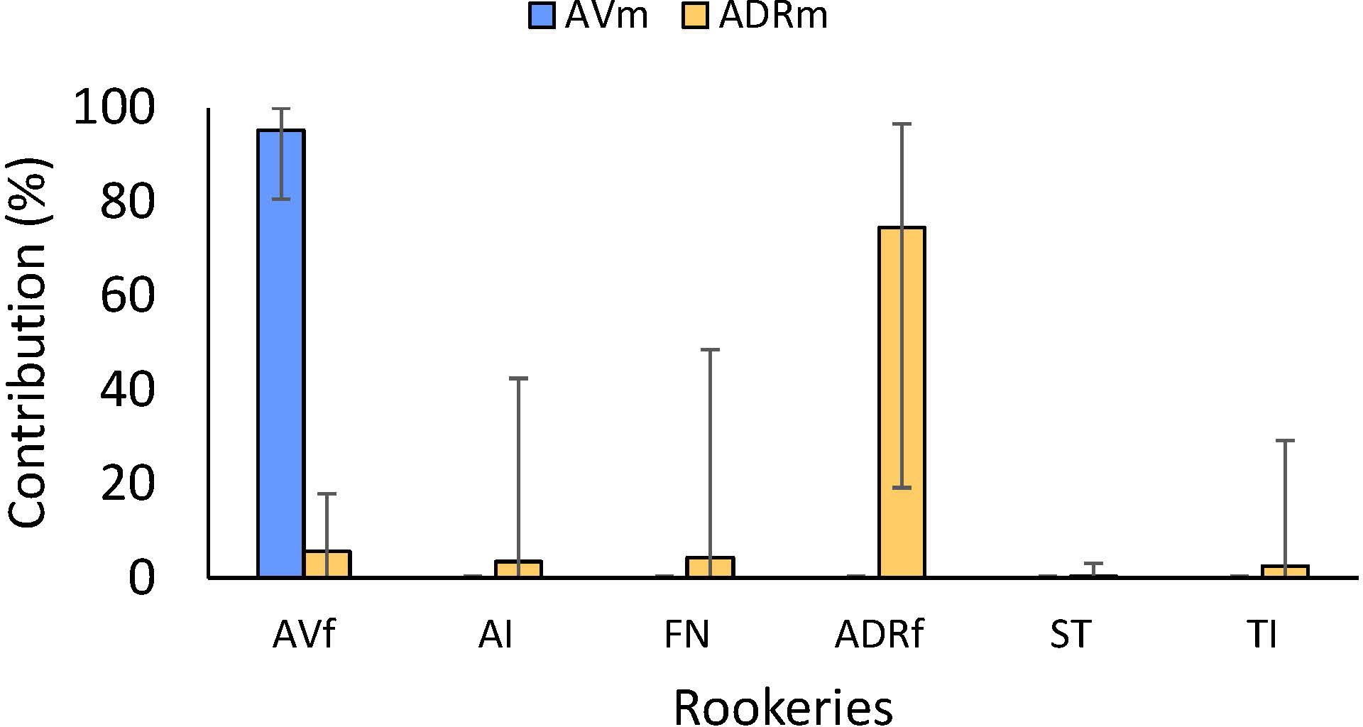 Mixed stock analysis of males from two courtship/mating aggregations in the Atlantic: Isla de Aves (AVm) and Atol das Rocas (ADRm). Only rookeries where contributions were higher than 1% from at least one of the aggregations are shown: Isla de Aves (AV), Ascension Island (AI), Fernando de Noronha (FN), Poilao (POI) and Trindade Island, Brazil. Detailed contributions from all potential rookeries are provided in Supplementary material, Supplementary Table S3.