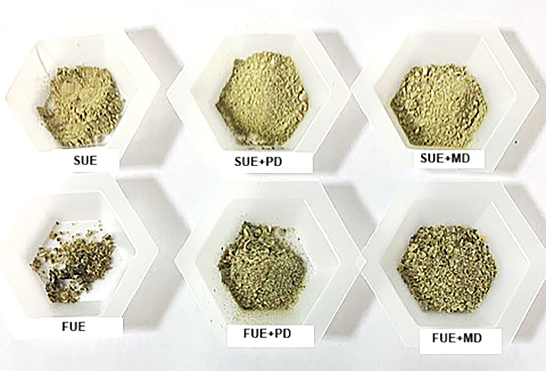 The novel encapsulation technologies were used to preserve bio-compounds extracted from Ulva spp. These methods are expected to improve the stability of Ulva’s extract, reducing the inactivation of sensitive polyphenolic compounds, especially natural pigments, while maintaining high process yield. Figure 2 shows the encapsulated extracts without added carriers (SUE; FUE) and their respective encapsulates, which include polydextrose (SUE+PD; FUE+PD) and maltodextrin (SUE+MD; FUE+MD).
