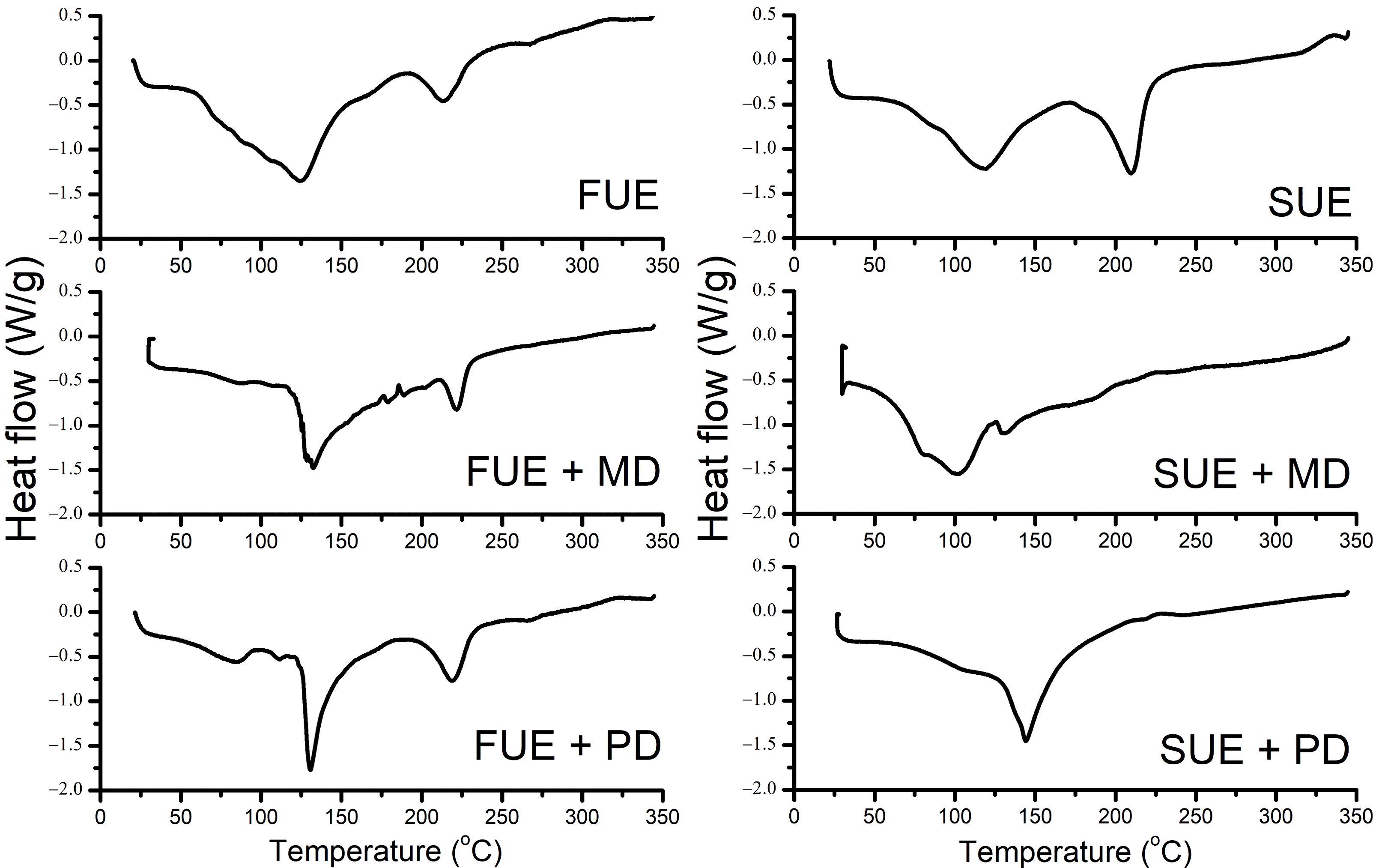 In the freeze-dried sample series, the pure extract (FUE) showed two distinct degradation steps, starting at 48.16°C and ending at 243.35°C, with an exceptionally high enthalpy of 410.53 J/g for the initial degradation. This result suggests strong internal bonding or firmly packed structures formed during freeze drying, which delayed thermal breakdown. Freeze-dried encapsulates with polydextrose (FUE+PD) displayed three degradation events, starting at 54.64°C and ending at 237.11°C, with a notable enthalpy for the second peak (152.59 J/g), demonstrating the formation of a relatively thermally stable powder. Among all samples, the FUE+MD encapsulate showed the highest thermal resilience. The temperature degradation within this sample started at 97.59°C and extended up to 210.98°C, with a high total enthalpy of 200.49 J/g. These data indicate strong molecular interactions between the extract and maltodextrin during freeze-drying, likely promoting more organized, less thermally sensitive structures (Table 2).