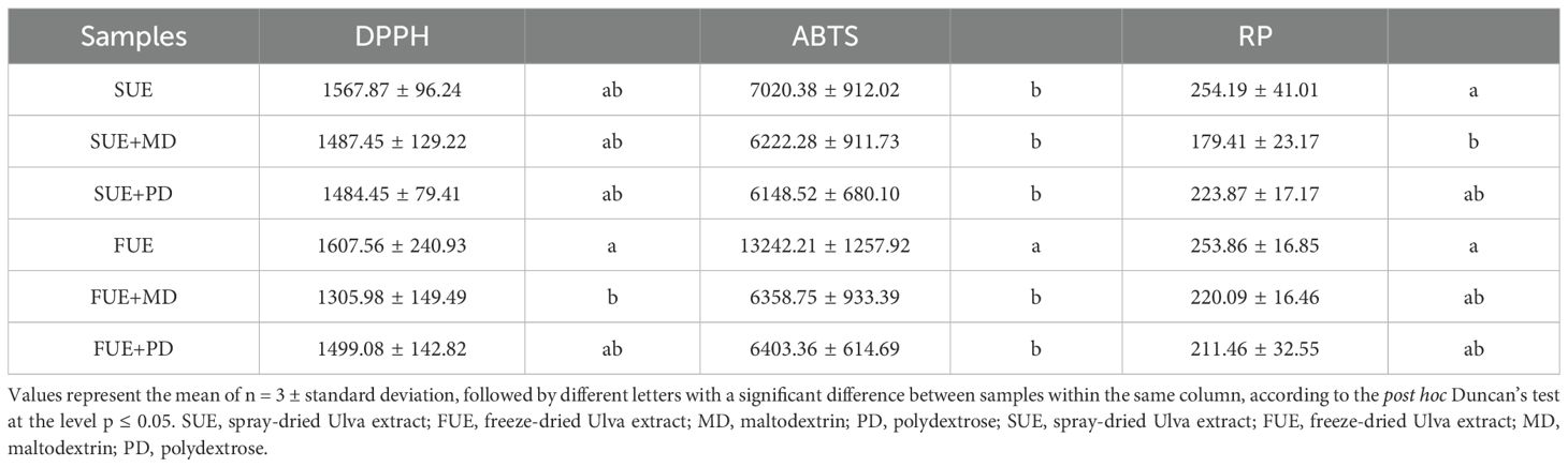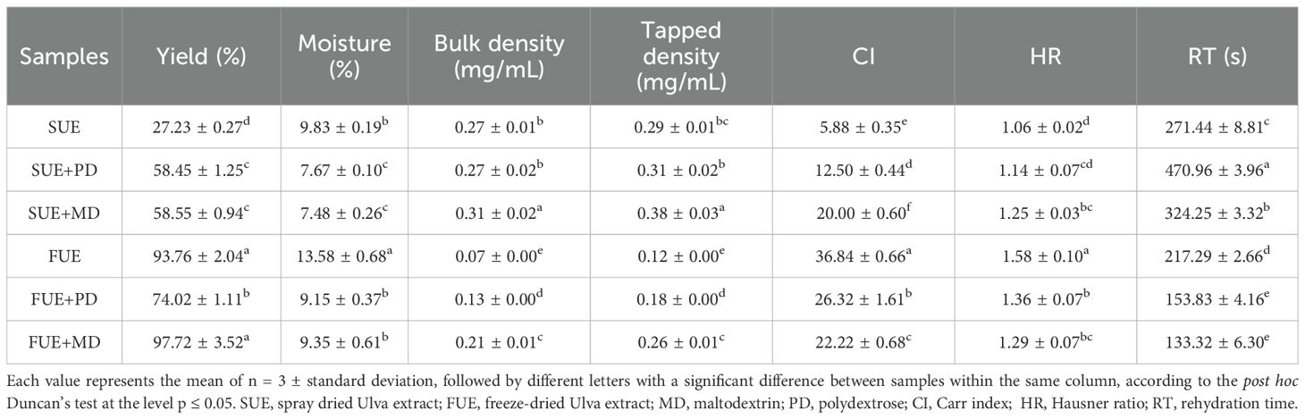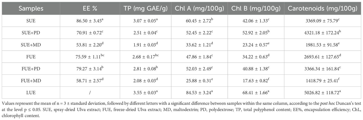 The yield of the encapsulated extracts in our study was significantly affected by both the type of encapsulation (spray or freeze drying) and the presence and type of carrier material (PD or MD) (Table 1). The highest process yields were observed with freeze-dried Ulva spp. extract, especially with FUE+MD (97.72 ± 3.52%) and FUE (93.76 ± 2.04%), which were not significantly different from each other (p > 0.05). This suggests that maltodextrin positively influences the process yield. Conversely, the addition of polydextrose (FUE+PD) resulted in a significantly lower yield (74.02 ± 1.11%), indicating that maltodextrin may be a more suitable carrier for freeze-drying Ulva spp. extract. The higher yield with MD could be attributed to the MD’s good and proven ability to form a matrix and have a stabilization efficiency during the encapsulation process (Ledari et al., 2024a). The lower yield observed with PD may be attributed to its weaker matrix-forming capacity and reduced stabilization efficiency compared to MD, which under freeze-drying conditions can result in greater structural collapse and material losses.
