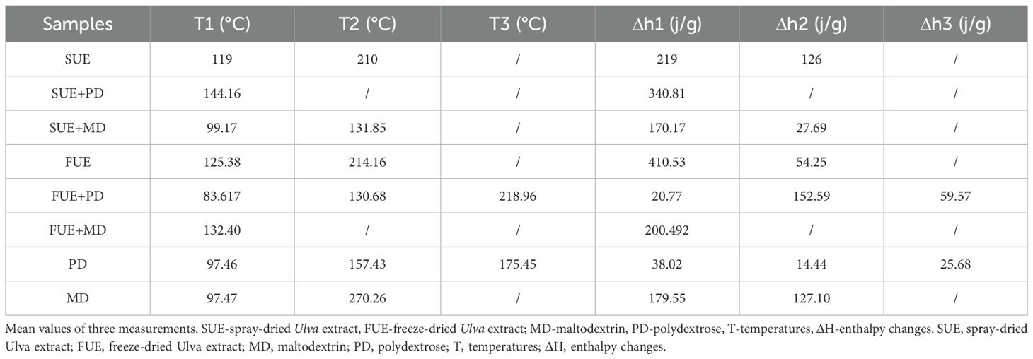 The DSC profiles of the pure carrier materials support these findings, exhibiting more thermal stability with the addition of Ulva extract. Polydextrose displayed three degradation transitions between 63.05°C and 193.28°C with relatively modest enthalpy changes, while maltodextrin presented two transitions from 39.81°C to 291.93°C, with significant energy requirements (Table 2). These observations reinforce that the biopolymers and drying (encapsulation) technique used play critical roles in shaping the thermal behavior of the final powder.