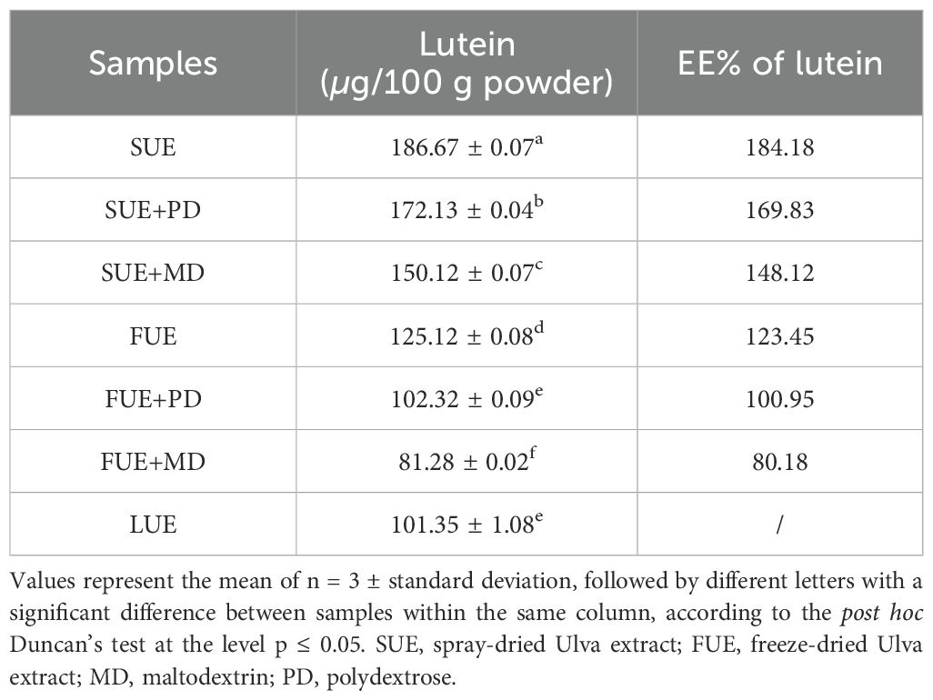 The encapsulation efficiency (EE%) for all microencapsulated powders was determined as the percentage of encapsulated polyphenolic compounds and lutein, as an individual carotenoid, relative to the total amount present in the liquid extract (LUE), based on the following Equation 5: