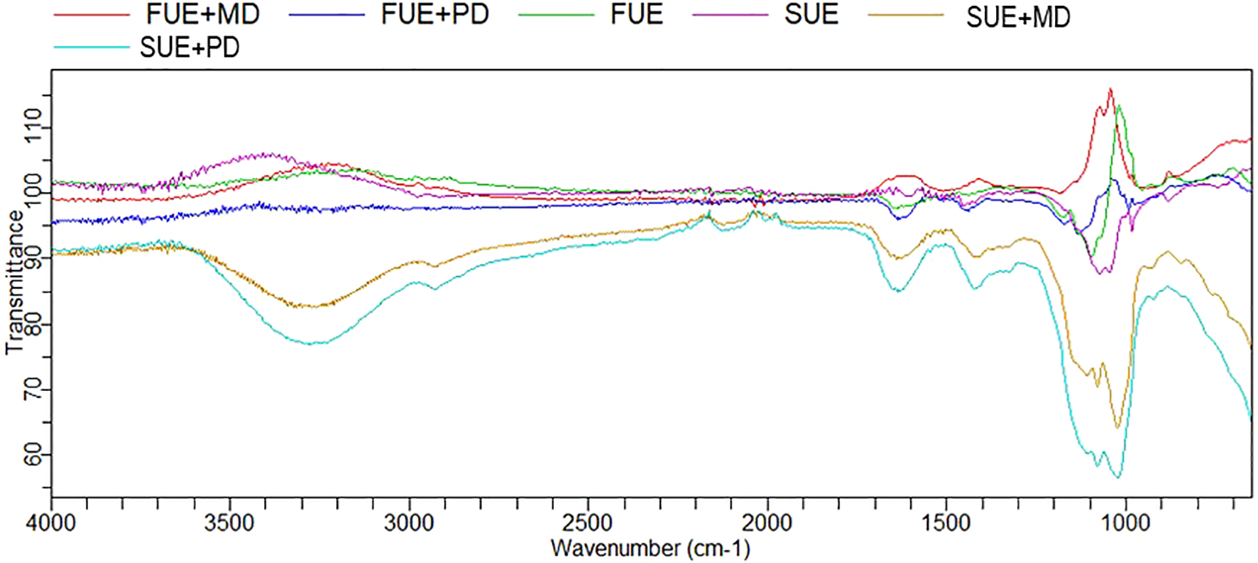 Regarding taped density values, SUE+MD had the highest value (0.38 g/cm³), indicating that adding maltodextrin enables a more compact structure during the tapping process. The SUE+PD (0.31 g/cm³) had a slightly lower, yet still superior, value compared to the other formulations. SUE (0.29 g/cm³) and FUE+MD (0.26 g/cm³) showed intermediate tapping densities, while FUE (0.12 g/cm³) and FUE+PD (0.18 g/cm³) had the lowest values, indicating poor compactability upon tapping.