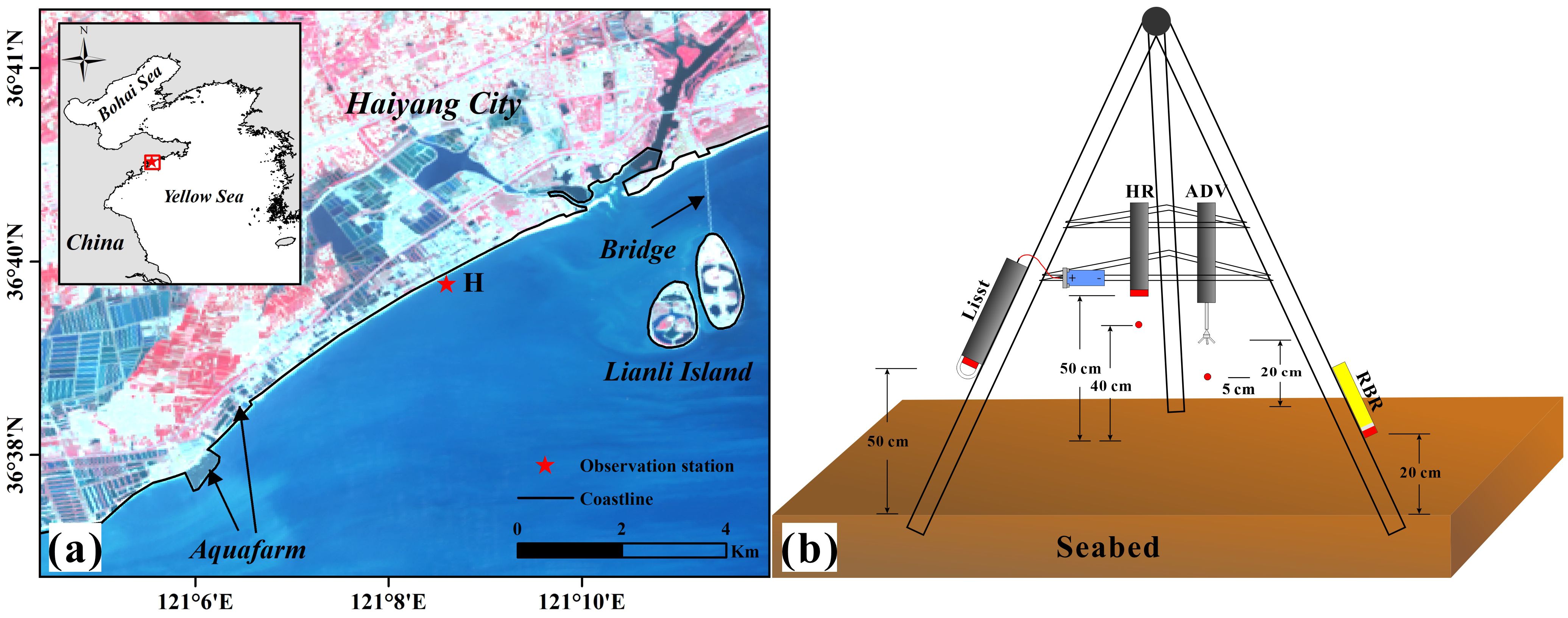 Figure 1. (a) Location of the study area (station H is the bottom-mounted observation station); (b) Schematic diagram of station H and the observation instrumentation.