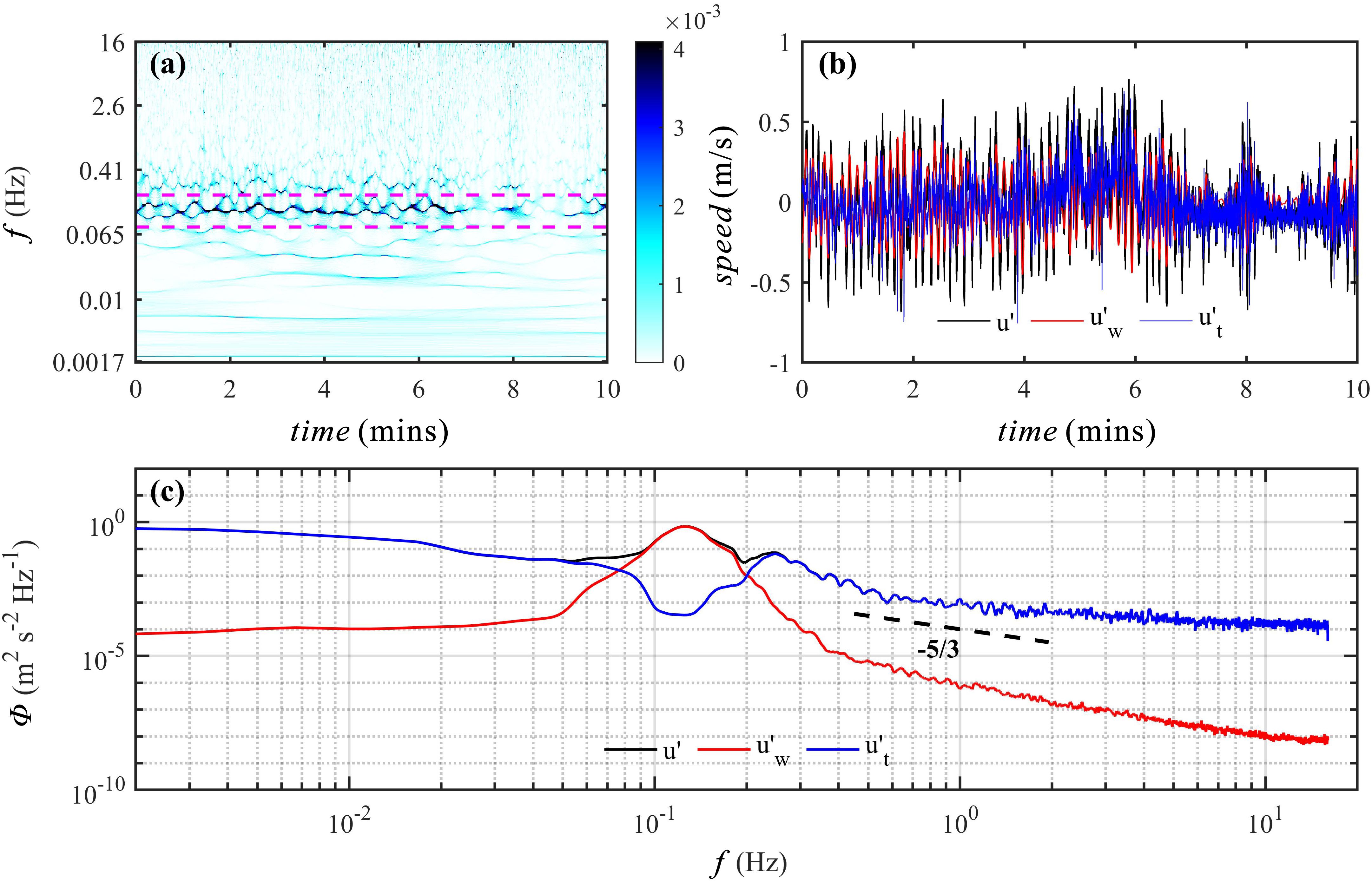 Figure 2. Wave-turbulence decomposition results of fluctuating velocity at Station H (6th burst, significant wave height approximately 1.33 m). (a) SWT analysis of fluctuating velocity, with the purple dashed lines demarcating the wave-dominated frequency range (0.08-0.2 Hz); (b) Time series of (black line), (red line), and (blue line); (c) Power spectra of (black line), (red line), and (blue line), with the black dashed line representing Kolmogorov’s “−5/3” theoretical spectrum.