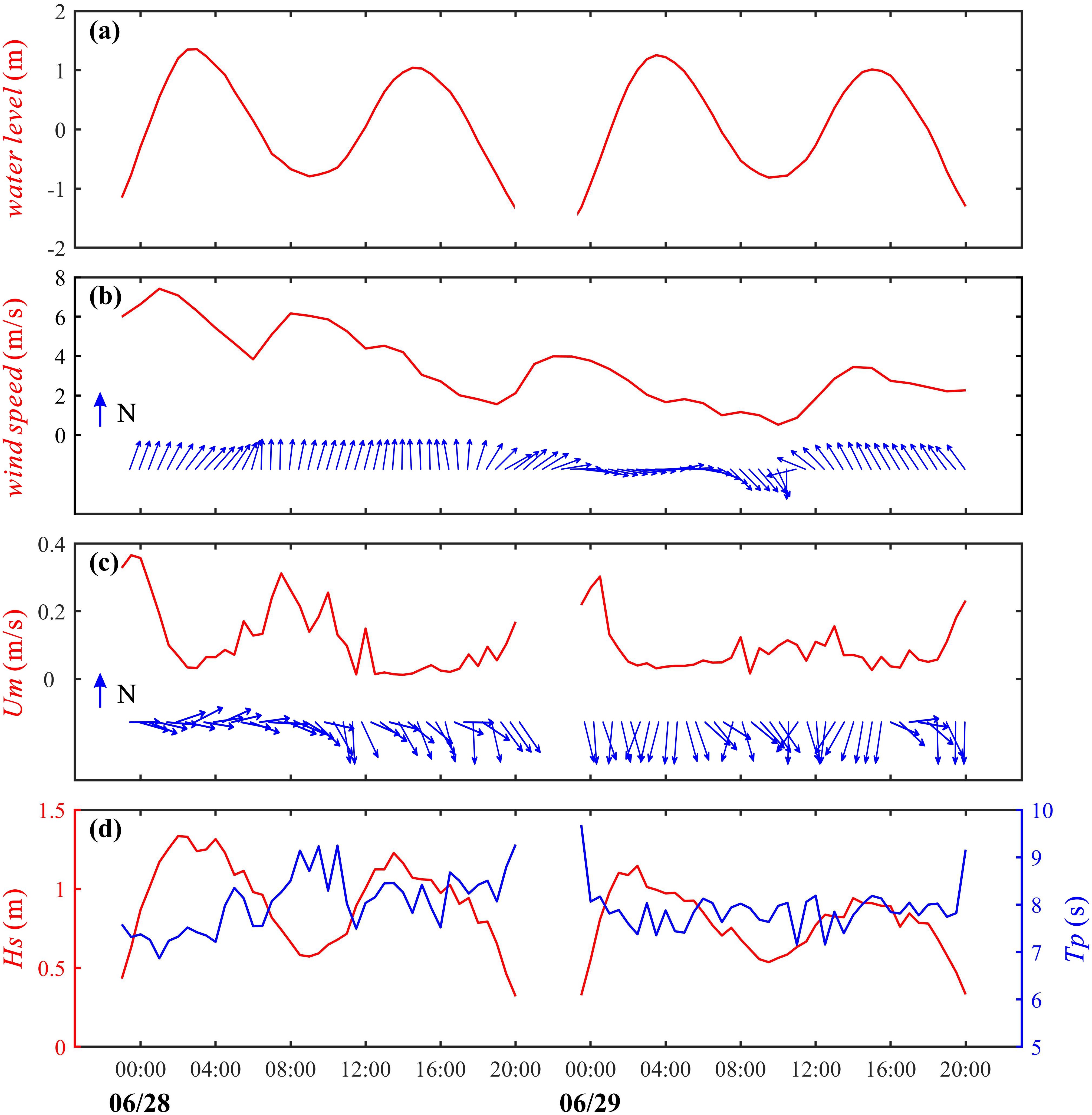 All instruments were synchronized to initiate measurements at 21:00 on June 27 and secured at the waterline during the lowest tidal phase to ensure temporal consistency. Additionally, wind field data were obtained from the National Center for Environmental Prediction Climate Forecast System Version 2 (NCEP-CFSv2) provided by the United States National Environmental Prediction Center (URL: https://rda.ucar.edu/datasets/ds094.1/index.html#!access). The spatial resolution of the dataset is 0.2°, and the temporal resolution is 1 hour.