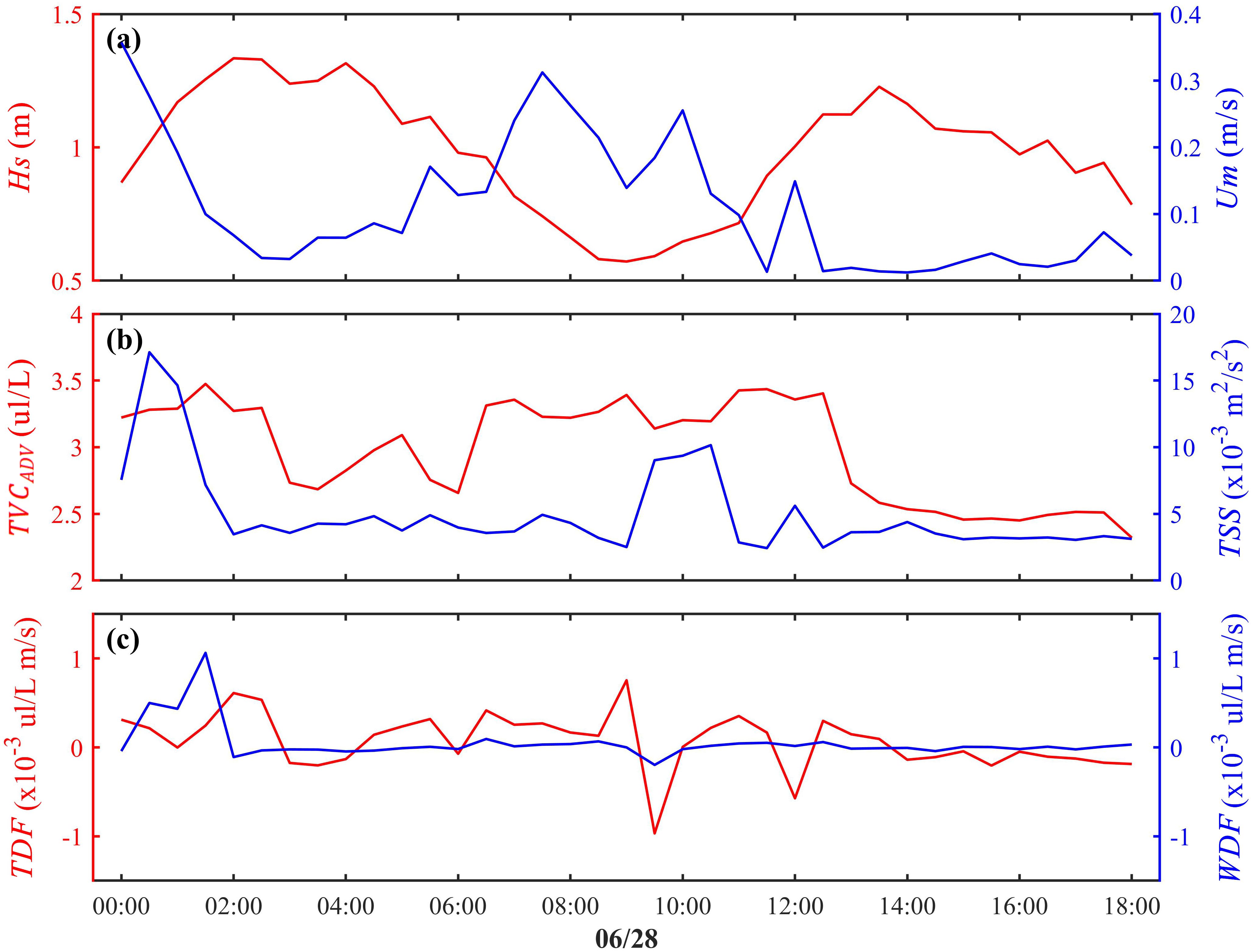 Figure 5. Time series of key parameters from 00:00 to 18:00 on June 28th at Station H: (a) Significant wave height (, red line) and horizontal current speed (, blue line); (b) Suspended sediment volume concentration (, red line) and total shear stress (, blue line); (c) Vertical turbulent-induced diffusion flux (, red line) and wave-induced diffusion flux (, blue line).