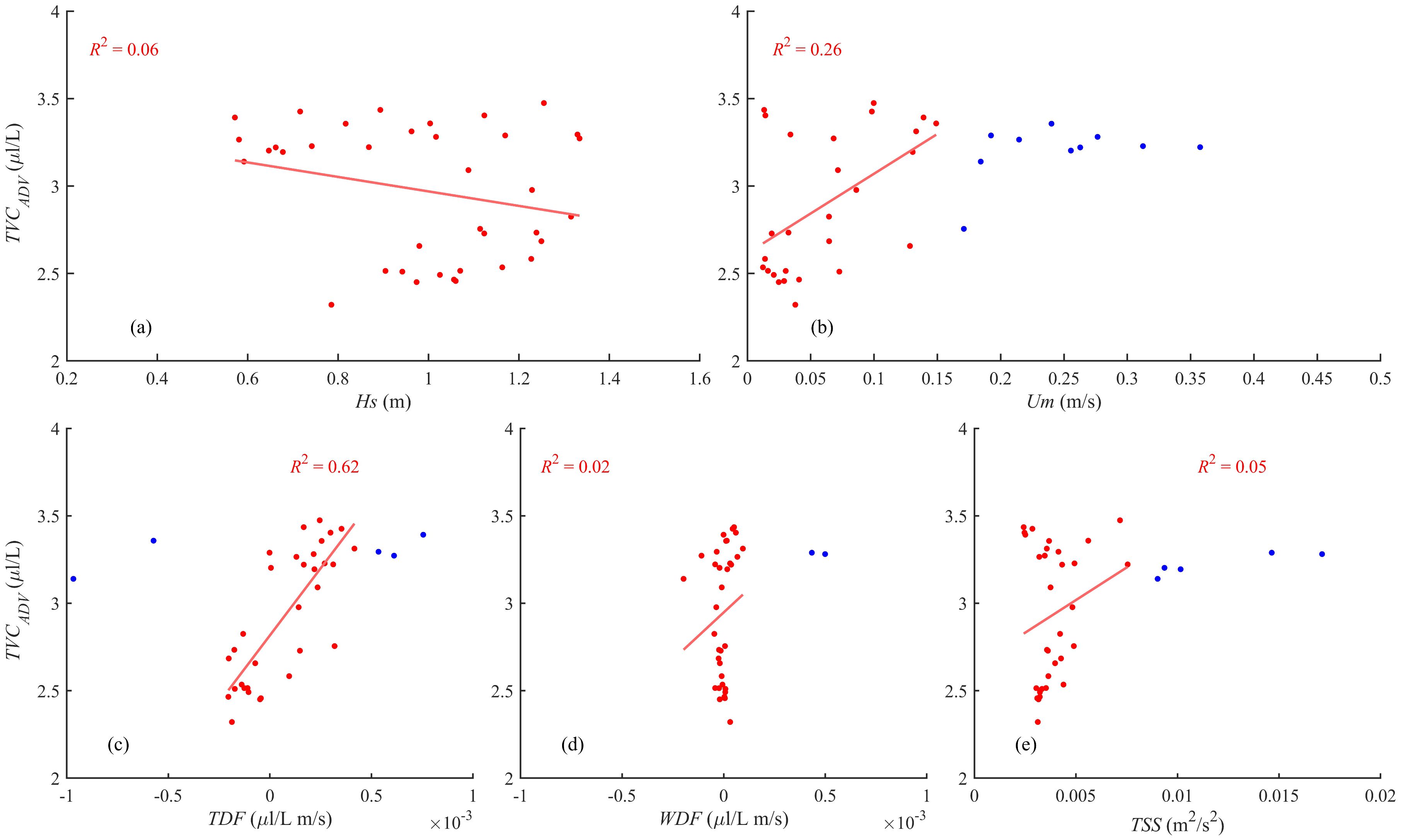 Figure 6. Scatter plots showing the relationship between the and various hydrodynamic factors. In each subplot, data points are filtered based on a specific threshold. Data points satisfying the threshold condition are shown in red and were used for the linear regression analysis (light red line), while data points that do not meet the threshold are shown in blue and were excluded from the analysis. The corresponding coefficient of determination () for each fit is displayed in red. The subplots correspond to: (a) significant wave height (), (b) horizontal velocity (), (c) tidal diffusion flux (), (d) wave-induced diffusion flux (), and (e) total shear stress ().