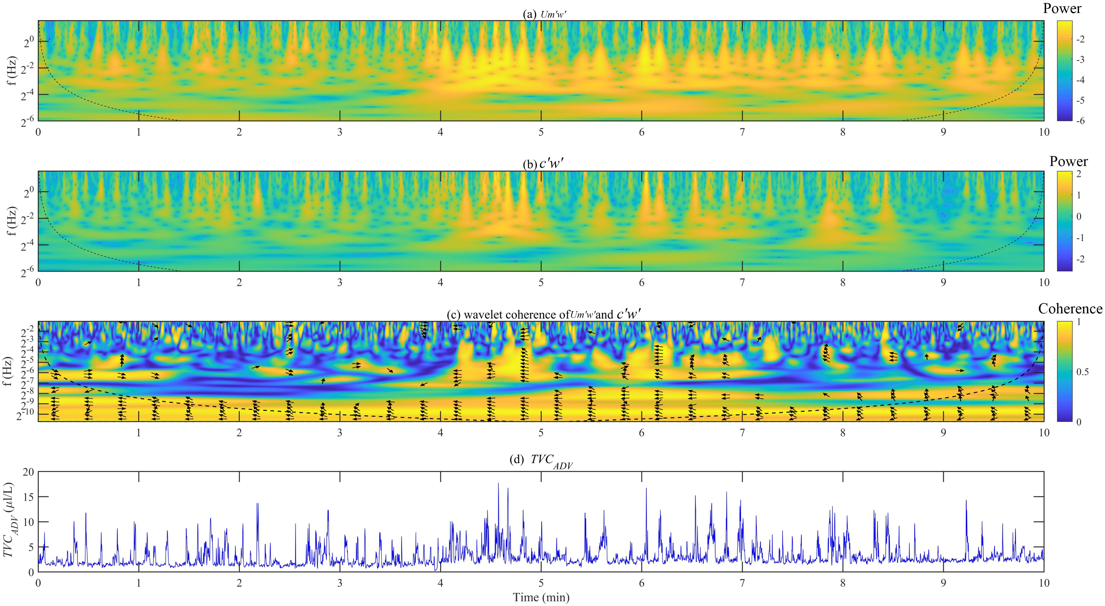 As a further illustration, the high correlation between (as the turbulence-induced vertical sediment diffusion flux) and is to be expected. That is, to demonstrate that turbulence dominates resuspension events, it is necessary to establish the correspondence between the instantaneous momentum flux () and the instantaneous sediment diffusion flux () in both the time and frequency domains. Wavelet analysis, which can determine the energy distribution of a signal across time and frequency, is widely used for the decomposition and visualization of oceanographic signals and thus provides an ideal tool for this purpose (Li et al., 2022; Sun et al., 2022; Zhang et al., 2022).