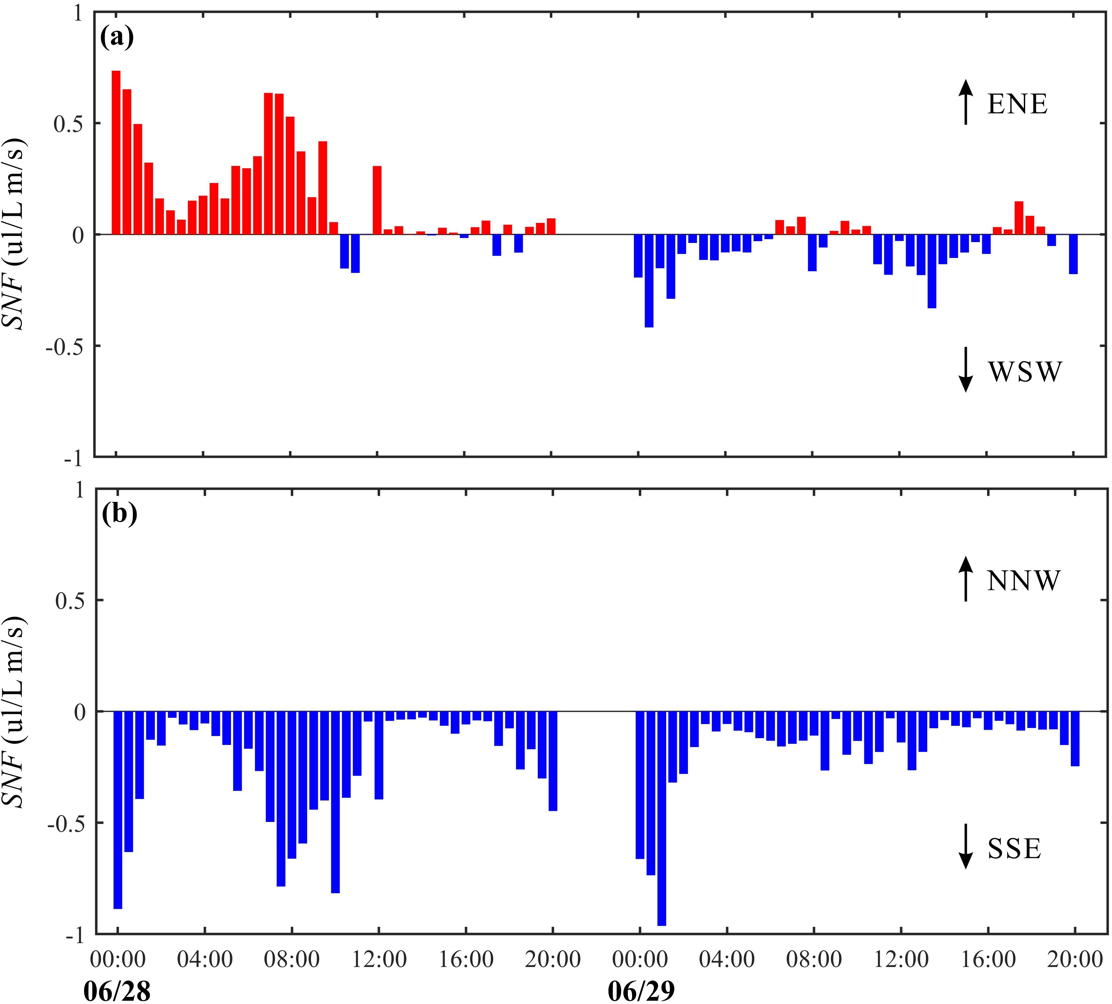 The sediment transport in the intertidal zone was investigated by calculating the sediment net flux () within the bottom boundary layer. The horizontal current components (u and v) measured by ADV were projected along the alongshore and cross-shore direction to derive alongshore and cross-shore components ( and ). The time series of alongshore and cross-shore (Figure 8) was obtained by vectorially multiplying ( and ) with synchronous , respectively, where positive values denote ENE (NNW)-directed transport and negative values indicate WSW (SSE)-directed transport.