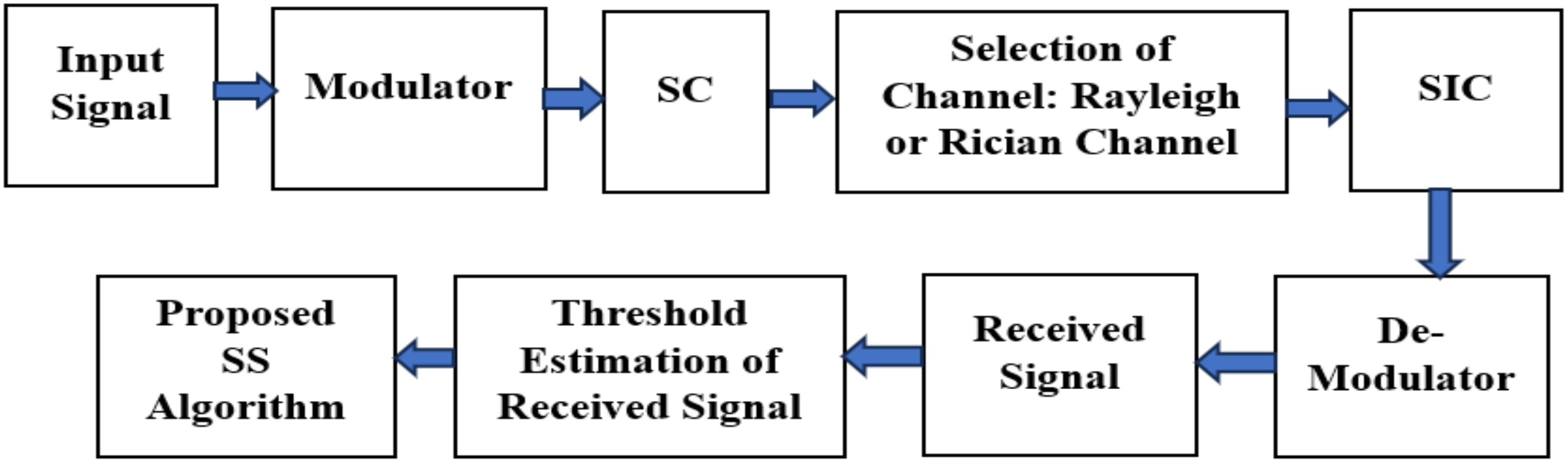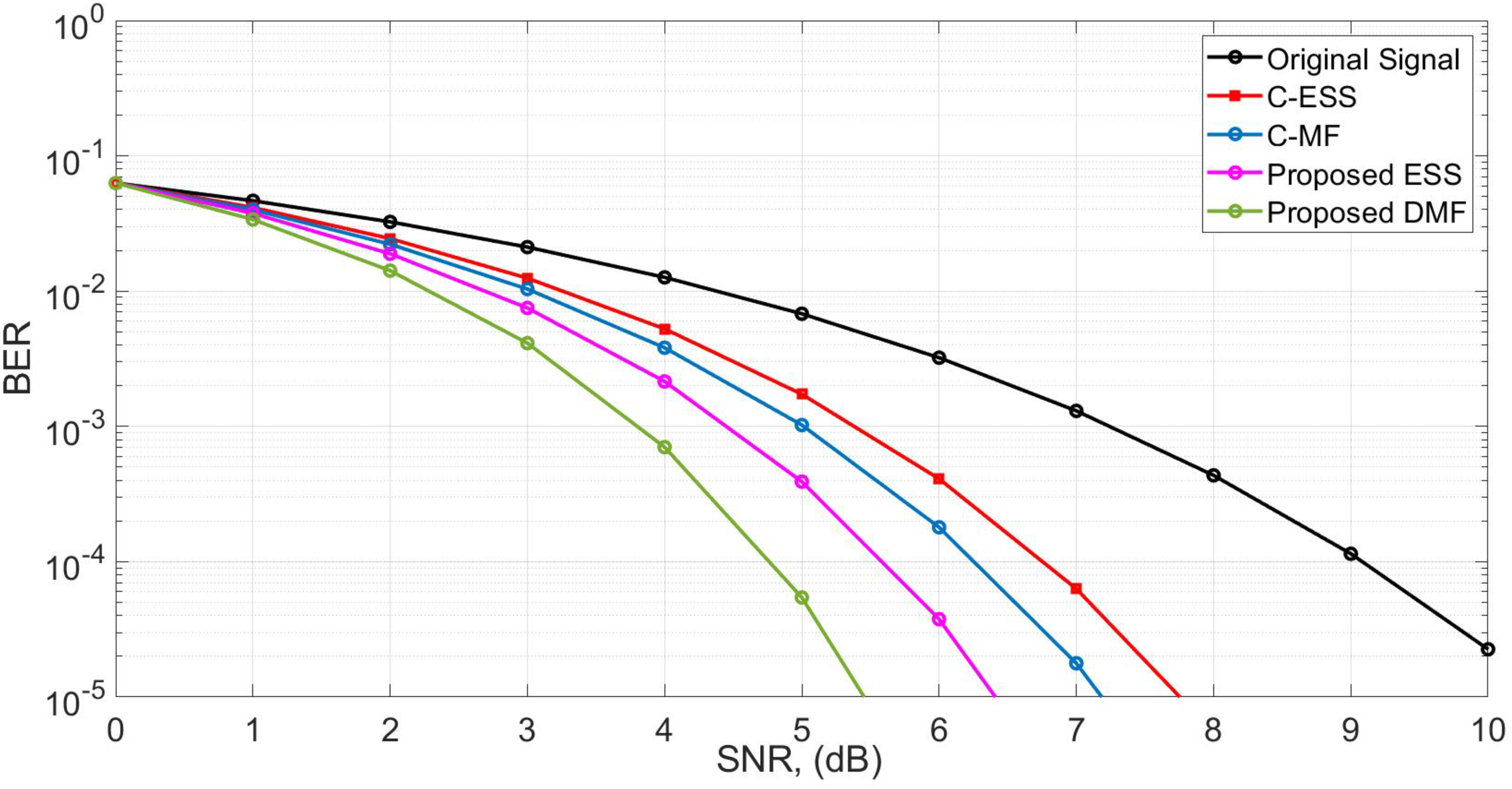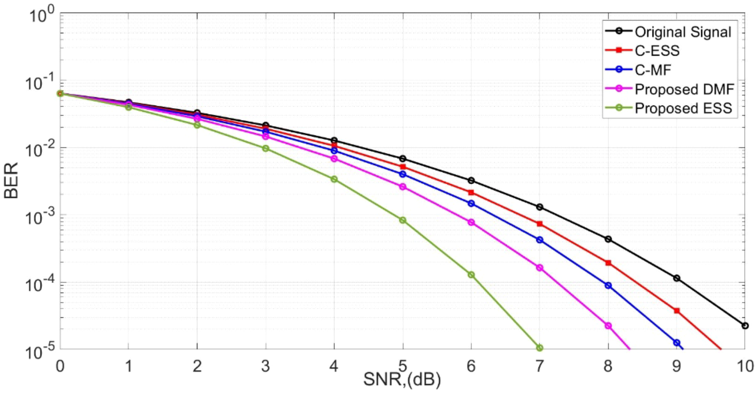 | Figure 10 | Rayleigh | BER vs. SNR | BER = 10⁻5 at DMF: 7; ESS: 8.2; C-MF: 9.1; C-ESS: 9.7; Ref: 10 | DMF and ESS reduce required SNR by 1.6–2.1 dB | Better BER and throughput under Rayleigh fading |