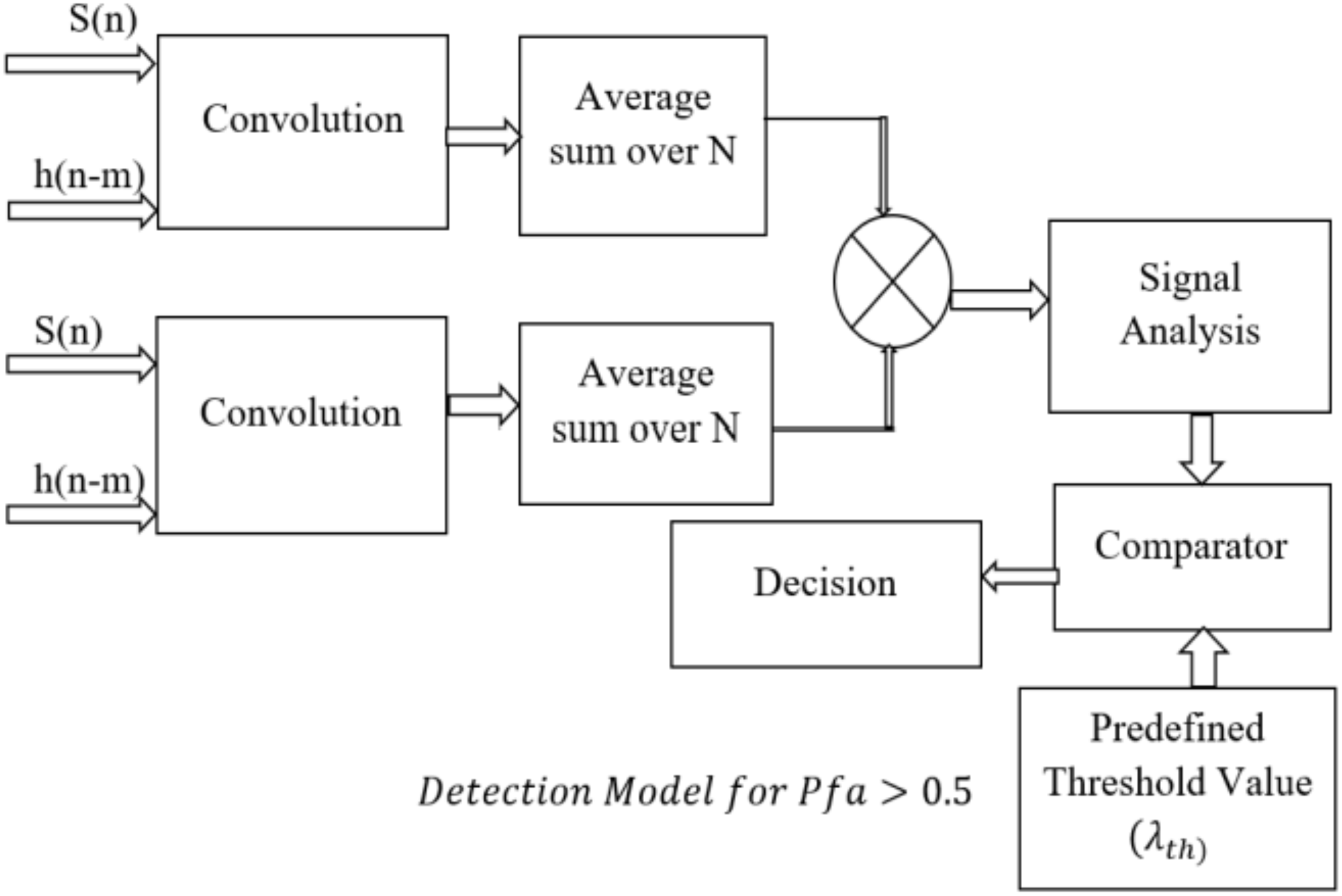 The Equations 4 and 5 models received samples, showing noise-only under H0 and signal-plus-noise under H1 for hypothesis testing. where z(n) represents the received signal, x(n) is the original transmitted signal, and is the noise of the Rician and Rayleigh channels. The signal threshold was estimated using the following equation: