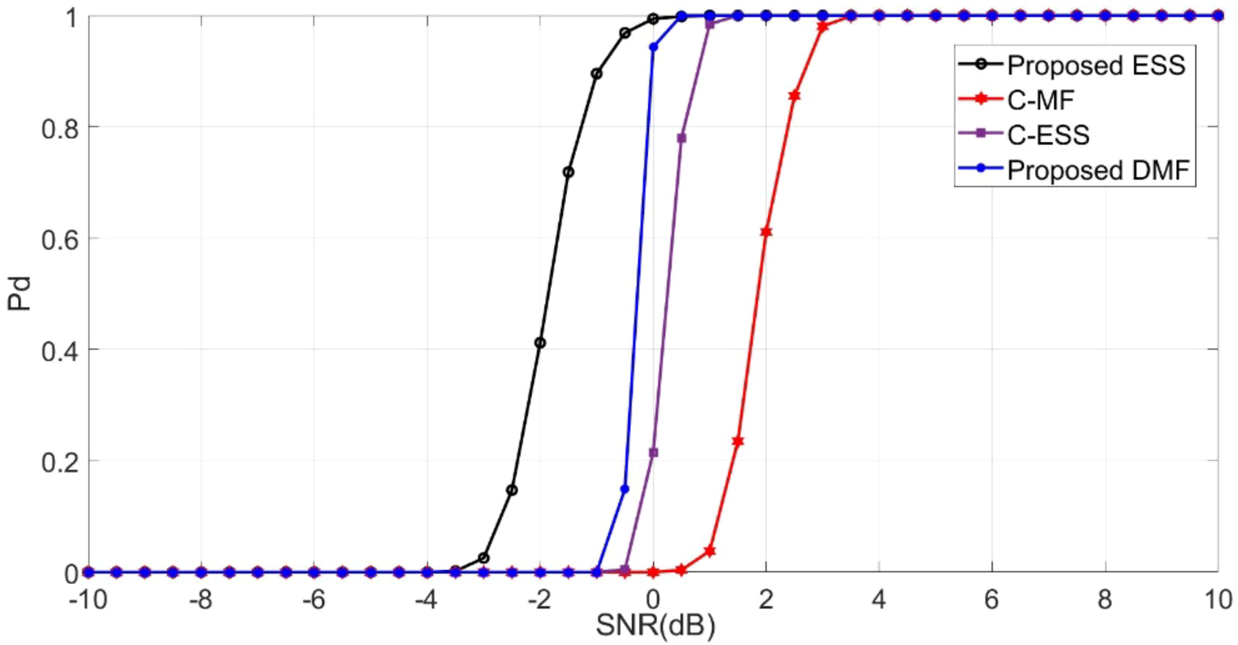 | Figure 4 | Rayleigh | Pfa < 0.5 | ESS: -1.0; DMF: 0.3; C-ESS: 1.1; C-MF: 2.8 | Proposed ESS achieves best detection at low SNR | Improved detection reliability under Rayleigh fading |