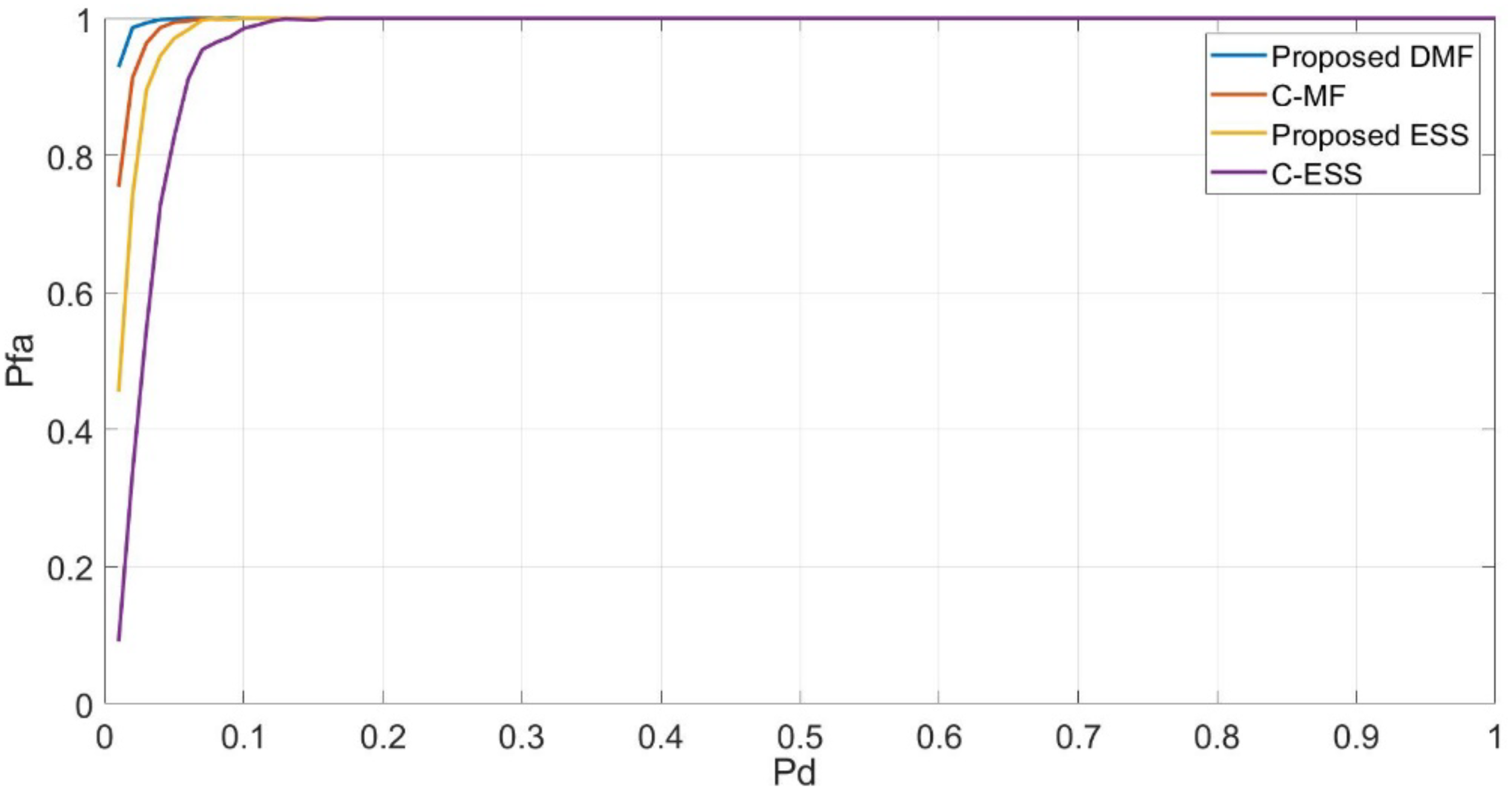 | Figure 8 | Rayleigh | Pfa vs. Pd | Pd max at Pfa: DMF 0.01, ESS 0.06, C-MF 0.1, C-ESS 0.18 | Proposed algorithms minimize Pfa | Improved Pd-Pfa trade-off |