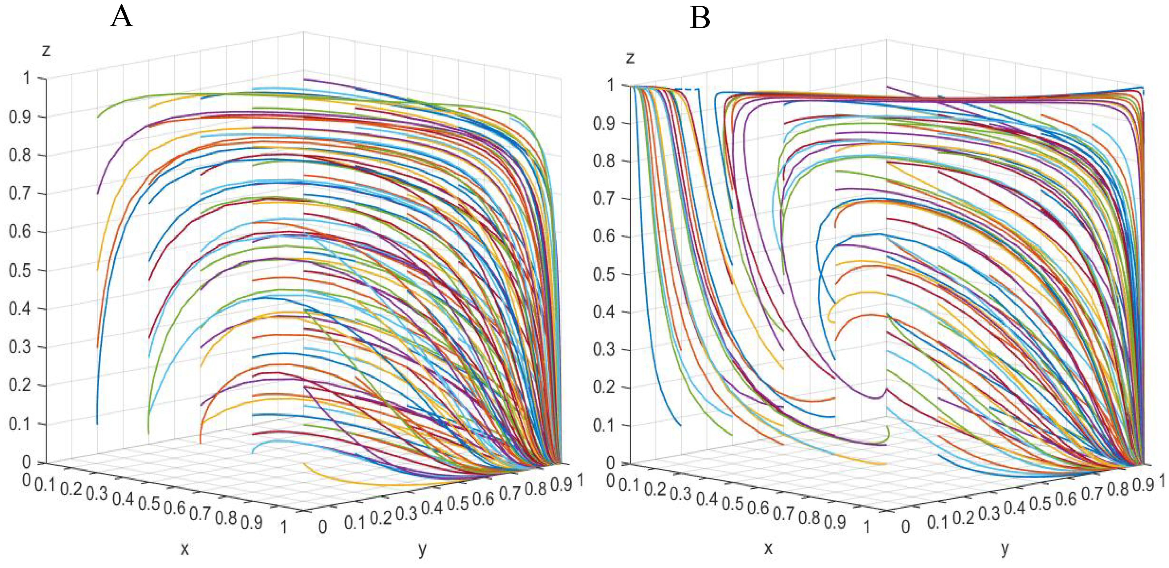 The phase diagram of strategy evolution in shipping companies is shown in Figure 2A. Among them, the x-, y-, and z-axis intervals are all [0, 1], with a total probability of 1. The shadow plane is a function of . When , is an ESS, and the arrow is pointing in the opposite direction of the x-axis.