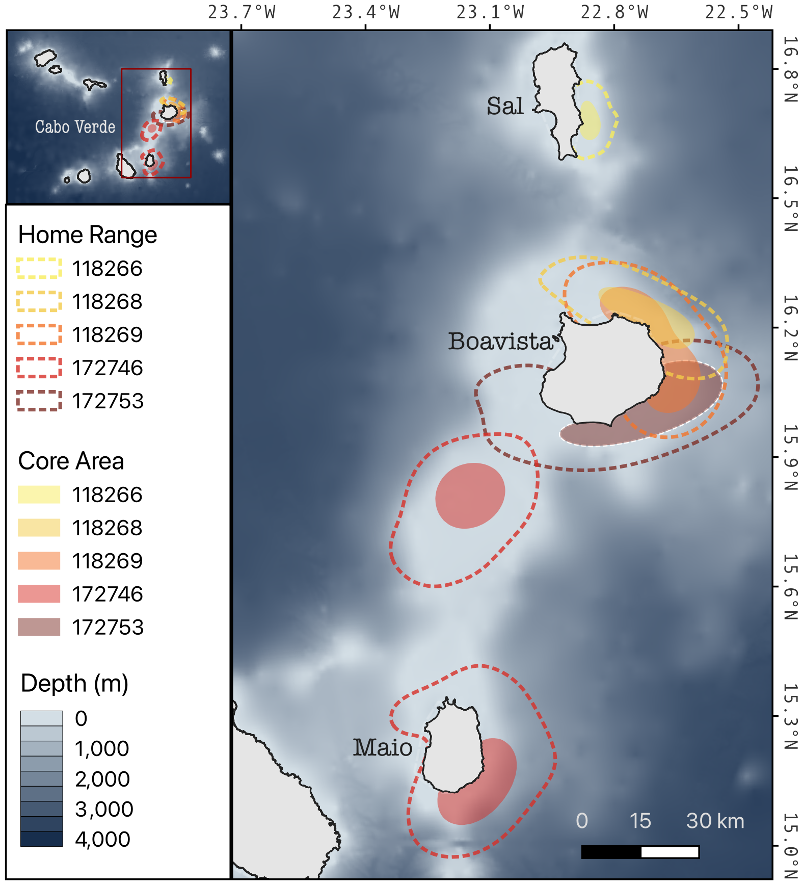 Tiger shark (Galeocerdo cuvier) habitat use in Cabo Verde. Home range (90% isopleths of Kernel density estimates) and core area use (50% isopleths) of tiger shark habitat use within Cabo Verde for all individuals for which enough data were available to calculate kernel densities (N = 5).