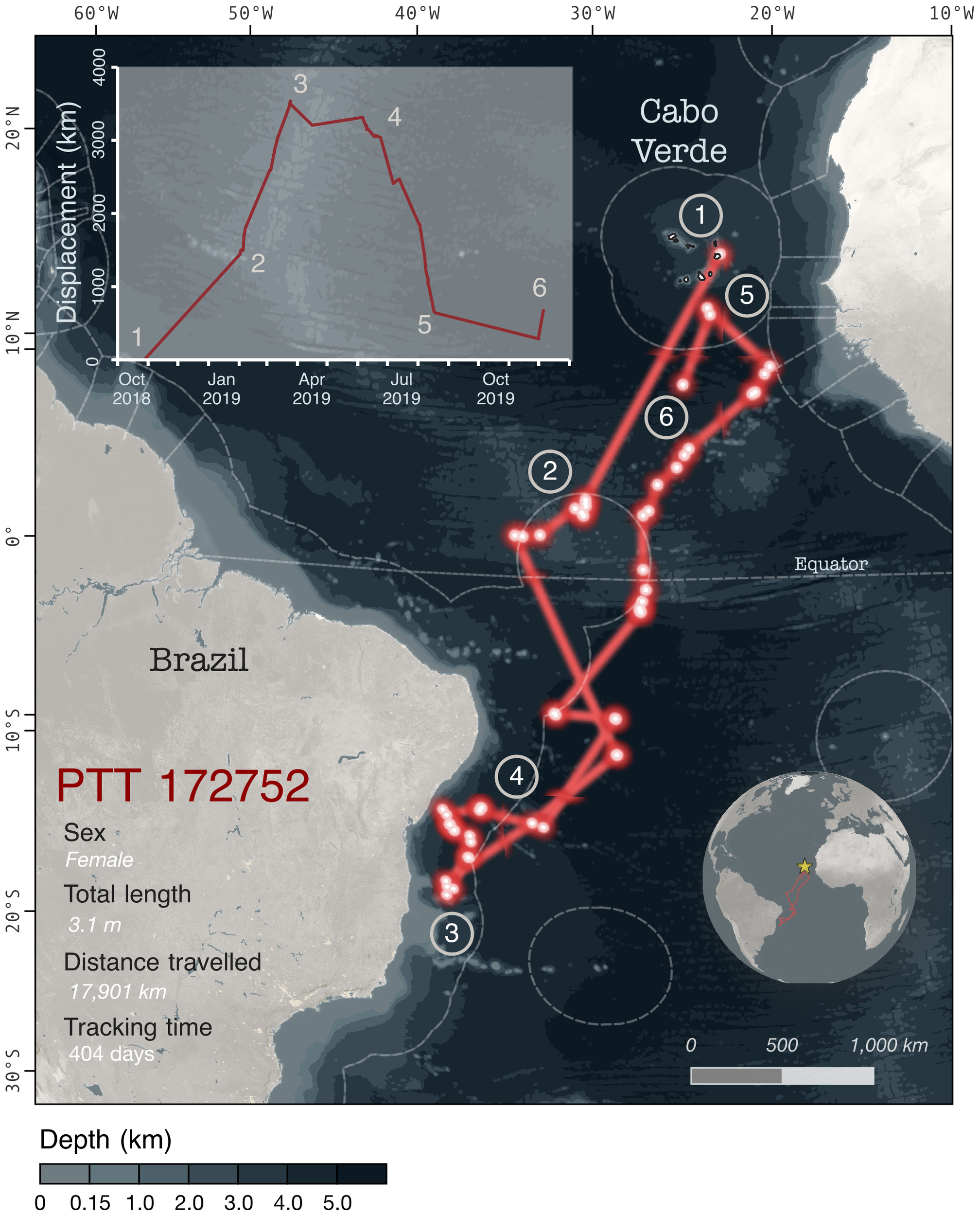 Transatlantic migration of a female tiger shark (Galeocerdo cuvier) from Cabo Verde. Tiger shark 172752 was tracked along a complete return migration across the Atlantic Ocean. Red line and dots represent the filtered location data and the track followed by the shark. The circled numbers along the track indicate significant events along the track and are explained in the bar at the bottom of the map. The insert graph shows the shark’s displacement (distance from tagging site) as a function of time; numbers in the graph refer to the events described above.