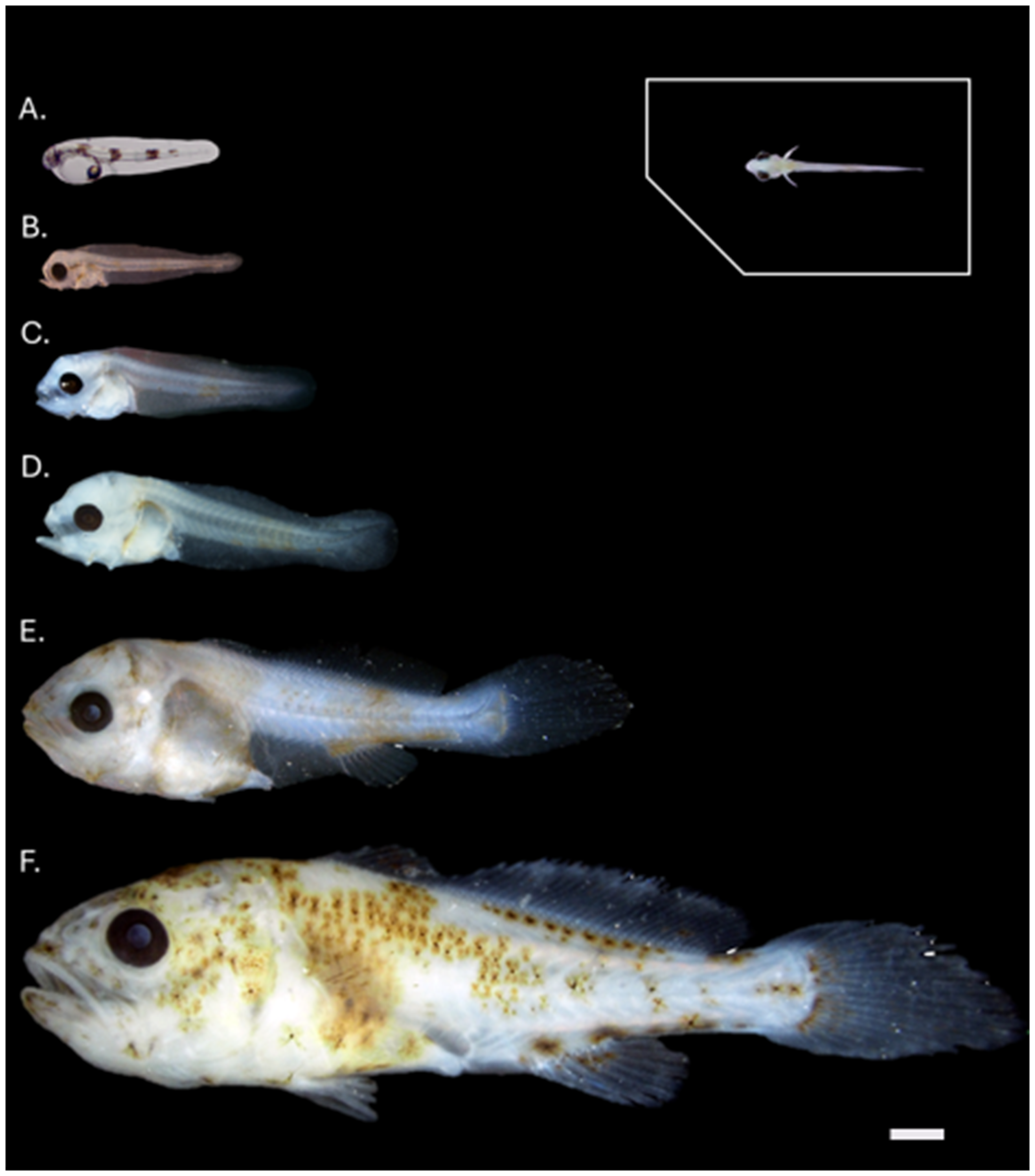 Early life stages of hatchery-reared meagre (Argyrosomus regius) reared at 21°C. (A) Hatching, 0-degree days post hatch (ddph) (0 dph), (B) 105 ddph (5 dph), (C) 252 ddph (12 dph), (D) 336 ddph (16 dph); (E) 546 ddph (26 dph); (F) 630 ddph (30 dph). Insert: larvae at 105° ddph (5 dph), showing pectoral fins. Note: larvae were fixed in buffered formalin prior being taken in photographs, which may explain the within color of soft body regions. Scale bar = 10 mm.