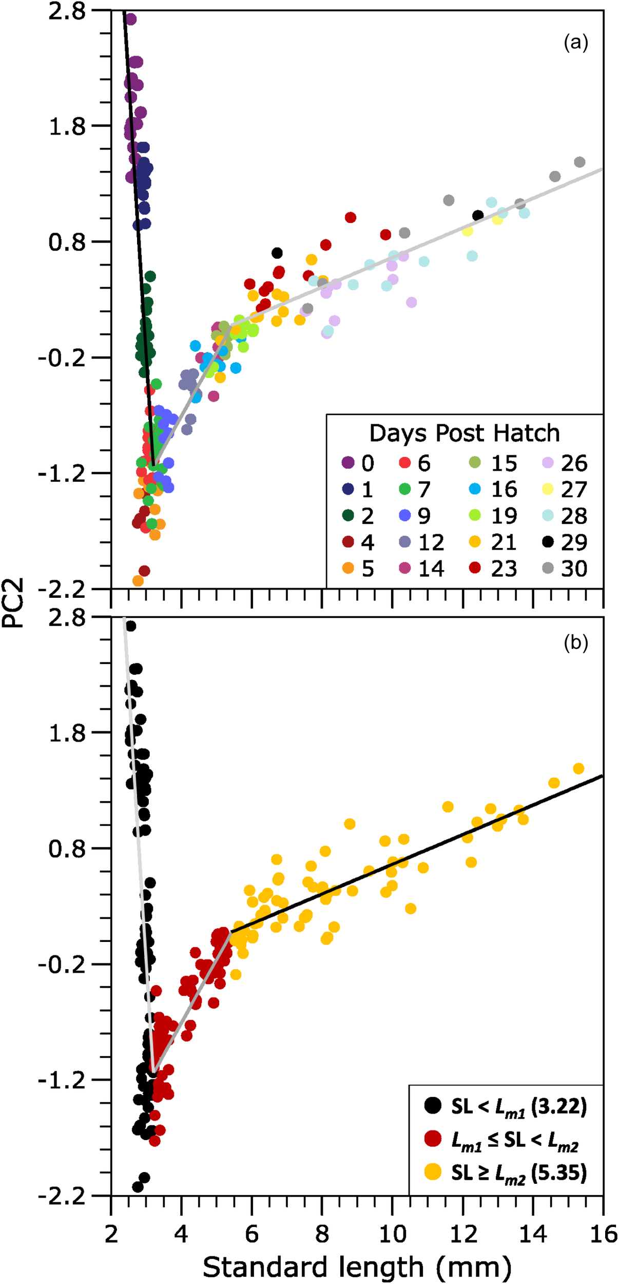 A principal component analysis (PCA) was performed on log-transformed morphometric characters using the covariance matrix, which preserves the natural variance structure among traits. The analysis included 228 individuals, each measured once, and data were transformed but not standardized (z-scored) prior to PCA, as transformation adequately normalized scale differences across morphometric variables (Khemis et al., 2013; Nikolioudakis et al., 2010). The PCA was performed across all developmental stages jointly, rather than separately per stage, to capture the overall ontogenetic trajectory of shape change during early development. PCA results were used to statistically define distinct growth periods, with inflection points (Lm1 and Lm2) determined by piecewise linear regression (PLR) fitted to the relationship between PC2 scores and standard length (SL). These points represent statistically derived breakpoints where the slope of PC2 versus SL changes significantly, indicating transitions between morphometric growth phases. Prior to applying the PLR, regression assumptions (normality and homoscedasticity of residuals) were verified using the Nortest package in R. This length represents the point at which the growth coefficients of the measured morphometric characters become isometric relative to the SL, marking the transition of fish larvae into juveniles from a morphometric point of view (Fuiman, 1983). The Kaiser–Meyer–Olkin (KMO) measure of sampling adequacy was employed to evaluate the suitability of the PCA results. The KMO value ranges from 0 to 1, with a value above 0.5 indicating sufficient interdependence among variables for PCA to be effective (Tabachnick and Fidell, 2000). When individuals with varying growth patterns are included in the PCA, the first principal component (PC1) captures both size and shape variations caused by growth allometry, while the second and subsequent components reflect the variations in distinct growth trajectories. As a result, different growth patterns across stages are represented as divergent PC2 trajectories when plotted against the PC1 or SL (Klingenberg, 2016).