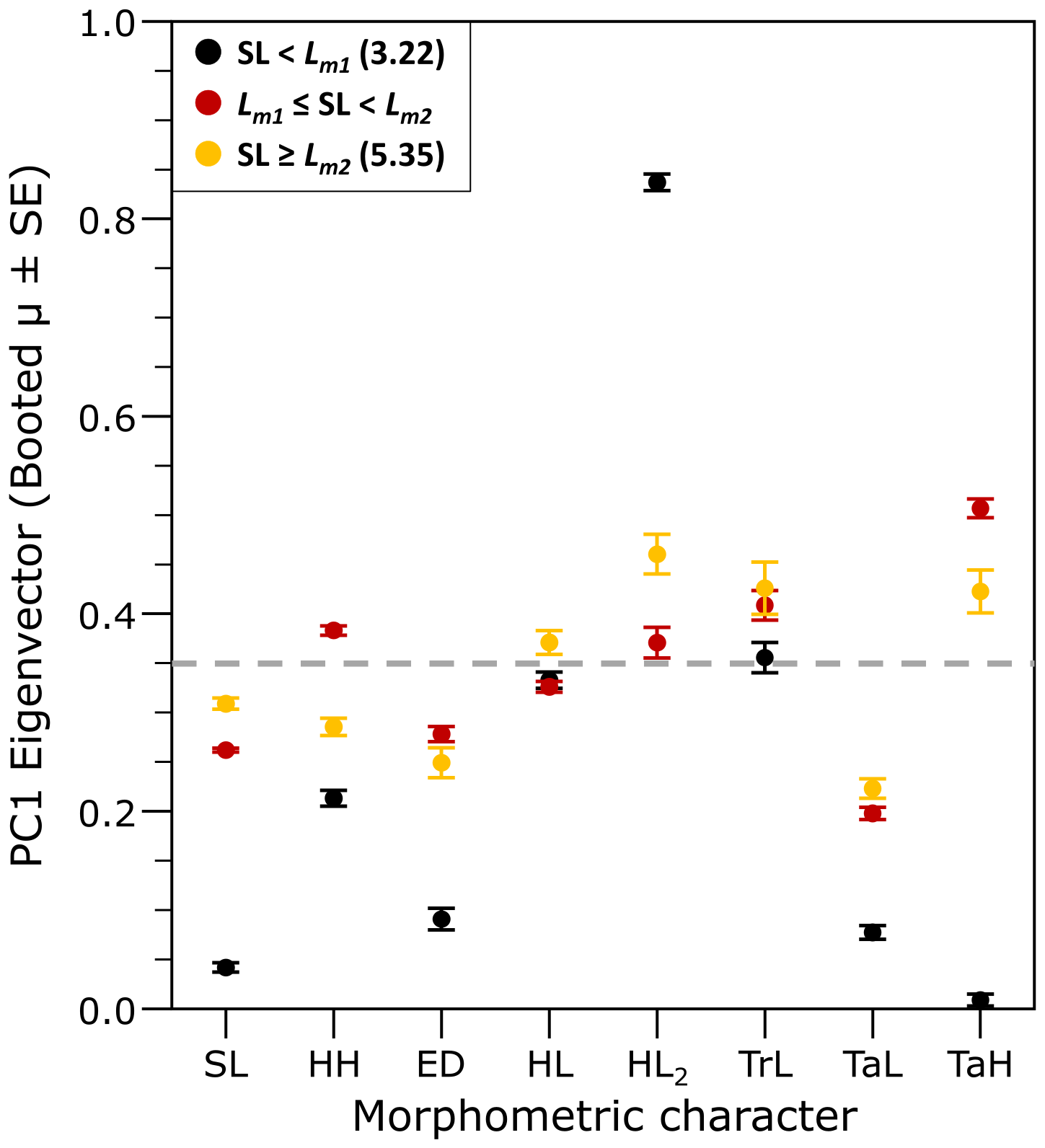 Principal component analyses (PCAs) conducted for different growth stages, separately, are also shown. Both Lm1 and Lm2 were estimated at 3.22 mm and 5.35 mm total length (TL), respectively. Rescaled loadings can be obtained by dividing raw scores with character standard deviation (σ). Bootstrapped standard error of the scores (SE, × 10–3) are also shown. Morphological characters are defined in the Materials and methods. % var.: Percent of variance explained.