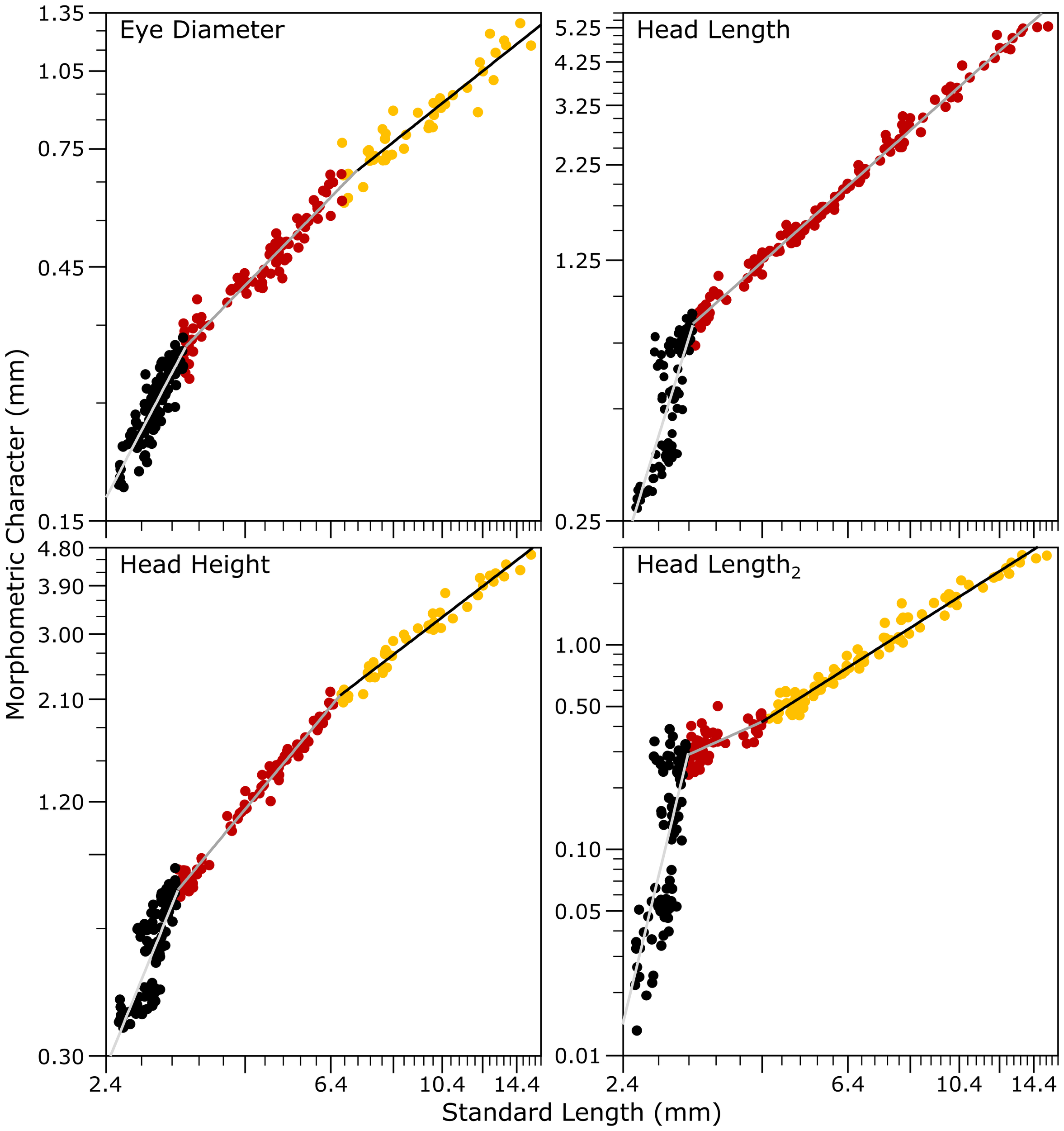 Inflexion points (IP) were estimated by piecewise linear regression, and subsequently b, r2, and n are obtained from the fit of the logarithmic form of the allometric growth model after accounting for fish stage by linear regression. HH: head height, ED: eye diameter, HL2: distance between eye and operculum, HL: head length, TrL: trunk length, TaL: tail length, TH: tail height. Significance is indicated as follows: ***P < 0.0005.