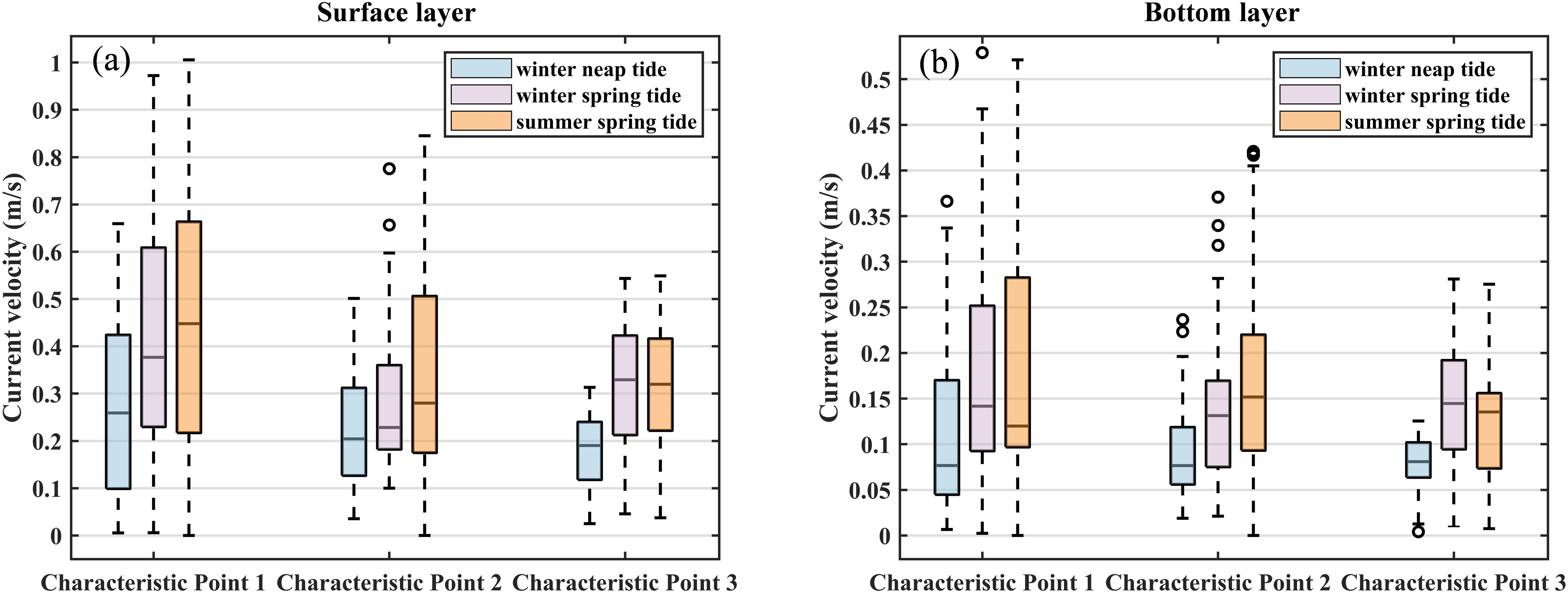 Figure 8. Velocity box plot of each point. (a) surface layer, (b) bottom layer. Blue represents winter neap tide, pink represents winter spring tide, and orange represents summer neap tide (time period: 72 hours).
