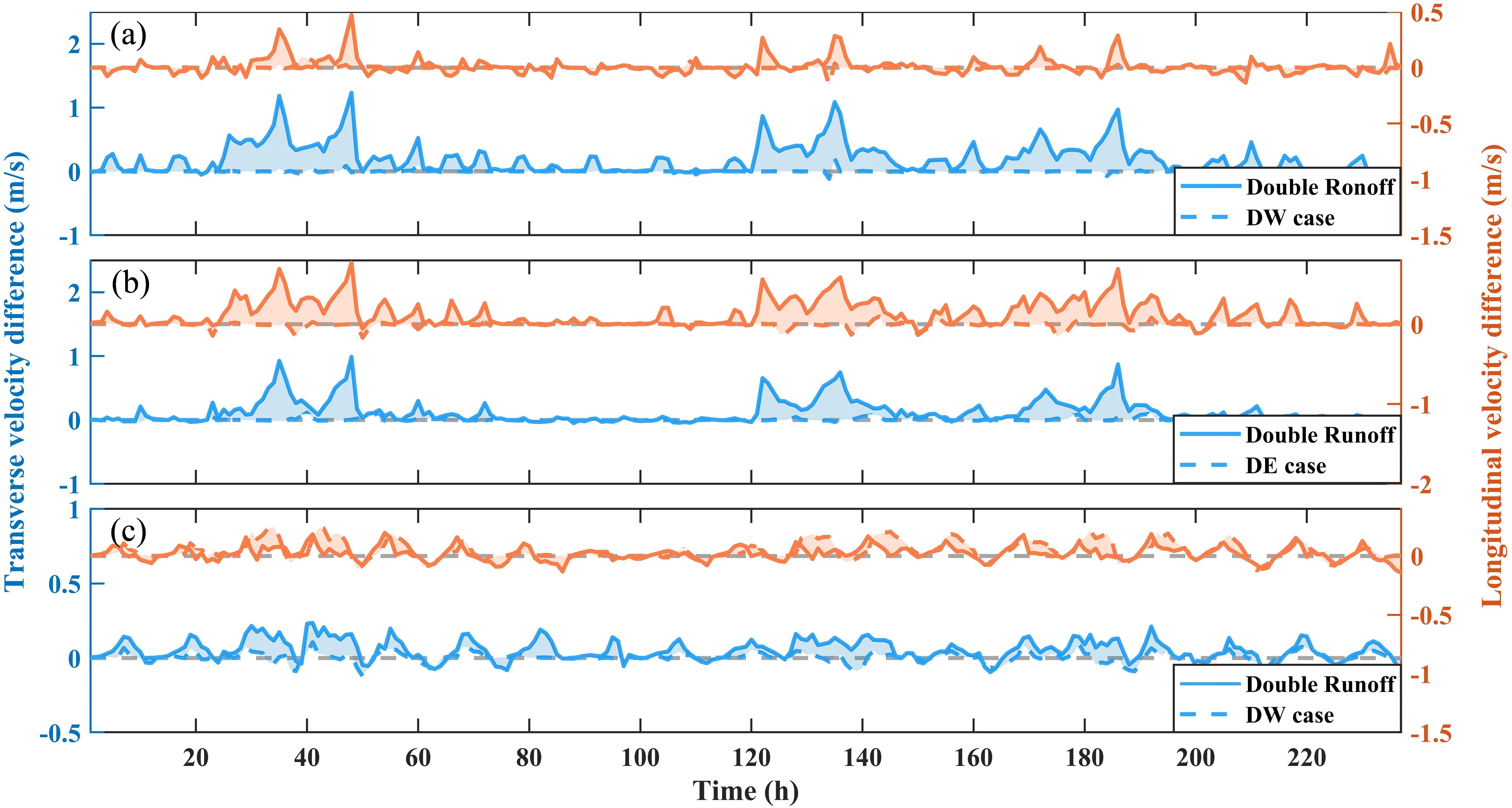 We selected the period of sustained strong runoff in summer and conducted a temporal analysis of the transverse and longitudinal components of the runoff-induced current at three characteristic points (Figure 13). Due to the highly consistent current distribution of the northern estuary under both the double-runoff and DE cases, characteristic point 1 only compares the current results of the double-runoff and DW cases (Figure 13a). Likewise, for characteristic point 2 in the southern estuary, the analysis compares only the double-runoff and DE cases (Figure 13b). The results indicate that in the absence of runoff, the velocities at the characteristic points approach zero. The addition of runoff significantly enhances the seaward and northeastward components of velocity at the estuaries, indicating that runoff input intensifies both offshore and alongshore currents. Specifically, the northern estuary runoff enhances the offshore current at characteristic point 1 (with a maximum increase of 1.3 m/s), while the southern estuary runoff primarily strengthens the northeastward alongshore current at characteristic point 2 (with a maximum increase of about 0.8 m/s). At characteristic point 3, the current distributions of the double-runoff and DE cases largely overlap, so only the results for the double-runoff and DW cases are plotted (Figure 13c). This suggests that the northern estuary runoff predominantly governs the offshore current field, primarily by enhancing the seaward component while weakening the northeastward component.