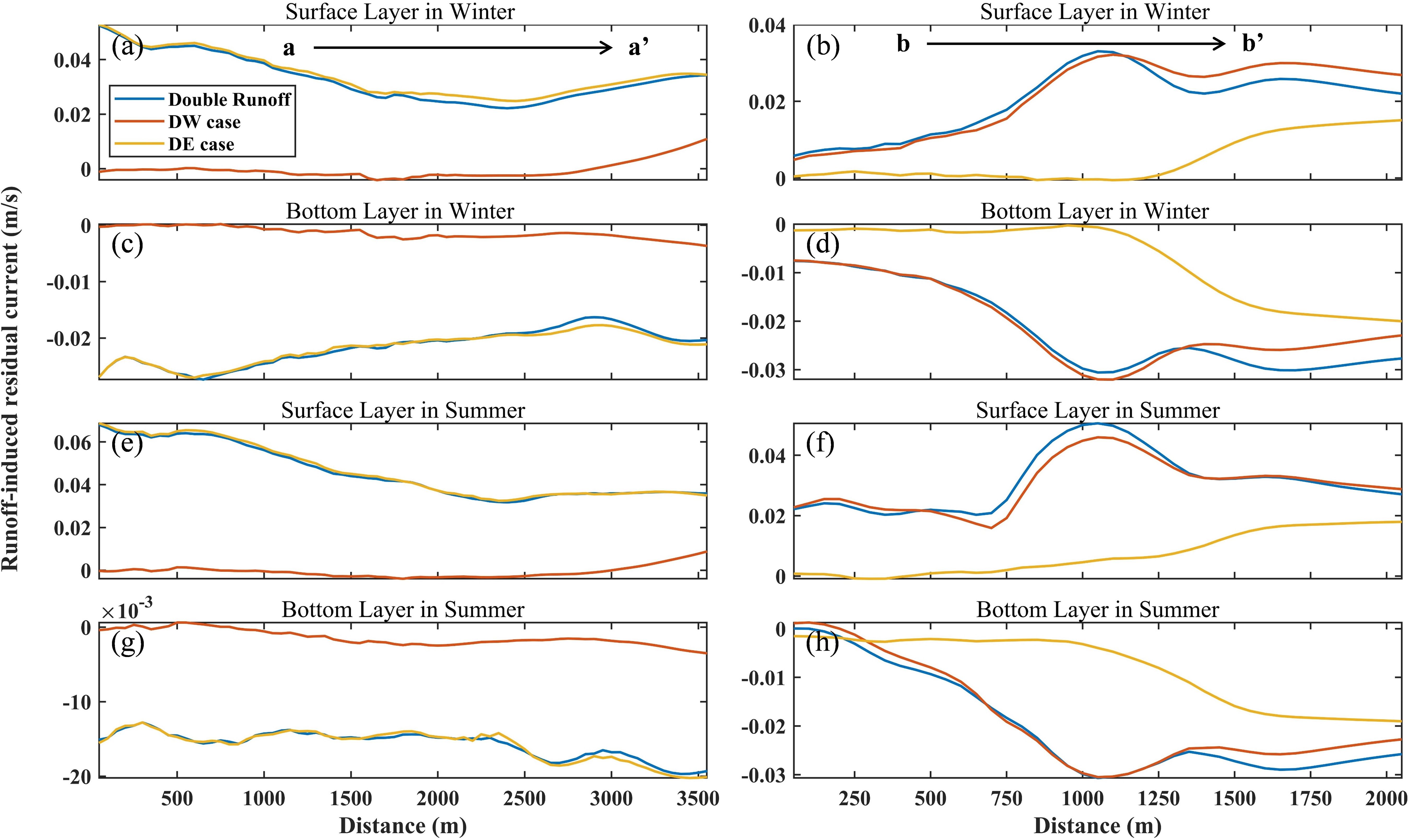 Figure 14. Distribution of runoff-induced residual flow along the profile under different cases. The first column is the a-a’ profile (a, c, e, g), and the second column is the b-b’ profile (b, d, f, h). The blue solid line is the double runoff case runoff-induced residual flow distribution, the orange solid line is the DW case runoff-induced residual flow distribution, and the yellow solid line is the DE case runoff-induced residual flow distribution (+: seaward, –: landward).
