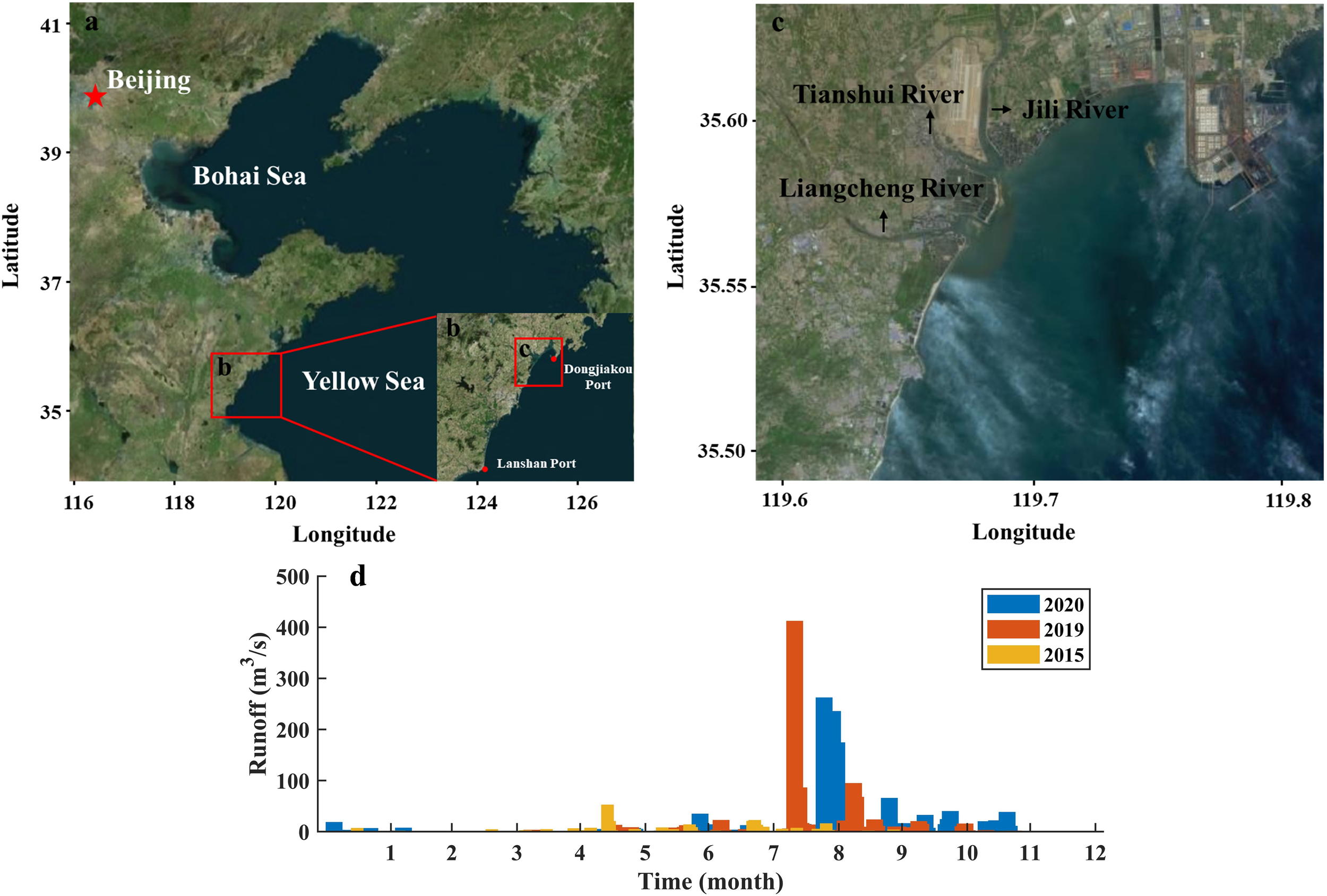 Geographic location of study area (a–c) and distribution of annual runoff of Liangcheng River in 2015, 2019 and 2020 (d).
