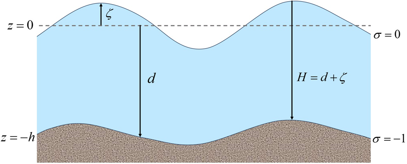 z is the vertical coordinate in physical space (Cartesian coordinate system); ζ is the elevation of the free surface above the reference plane (z = 0); d is the water depth below the reference plane; H is the total water depth (H = d + ζ) (Figure 2).