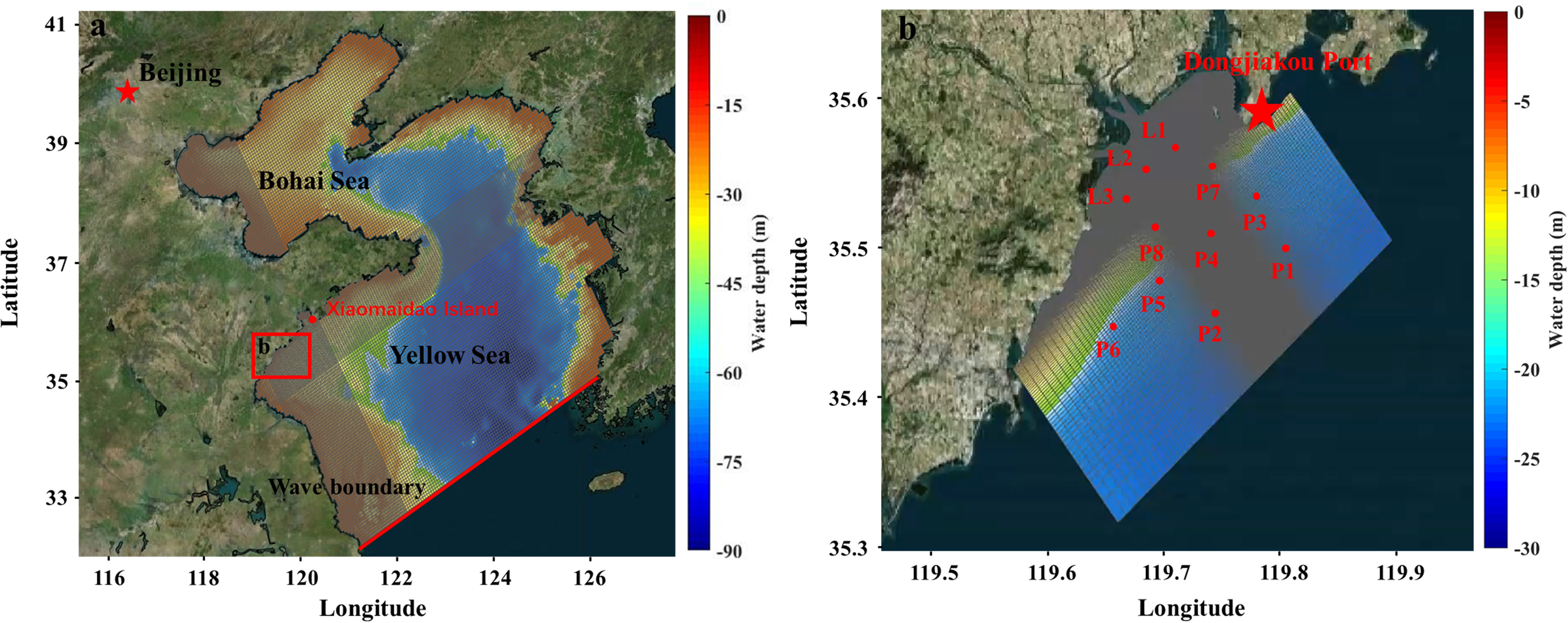 The model bathymetry is based on 2018 digitized nautical chart data, and the simulation time step is set to 60 s. Open boundary conditions include wave, water level, and runoff. Wave boundary conditions for the fine grid are interpolated from the large-scale hydrodynamic simulation, which itself uses wave data from the ERA5 database (Hersbach et al., 2020). The water level boundary is extracted from the NAO.99b global tidal model (Matsumoto et al., 2000), incorporating eight primary constituents (K1, K2, M2, N2, O1, P1, Q1, and S2). There are three rivers entering the sea within the study area, with two on the north side converging before entering the sea. Daily runoff data are sourced from the Rizhao and Qingdao Hydrological Bureaus.