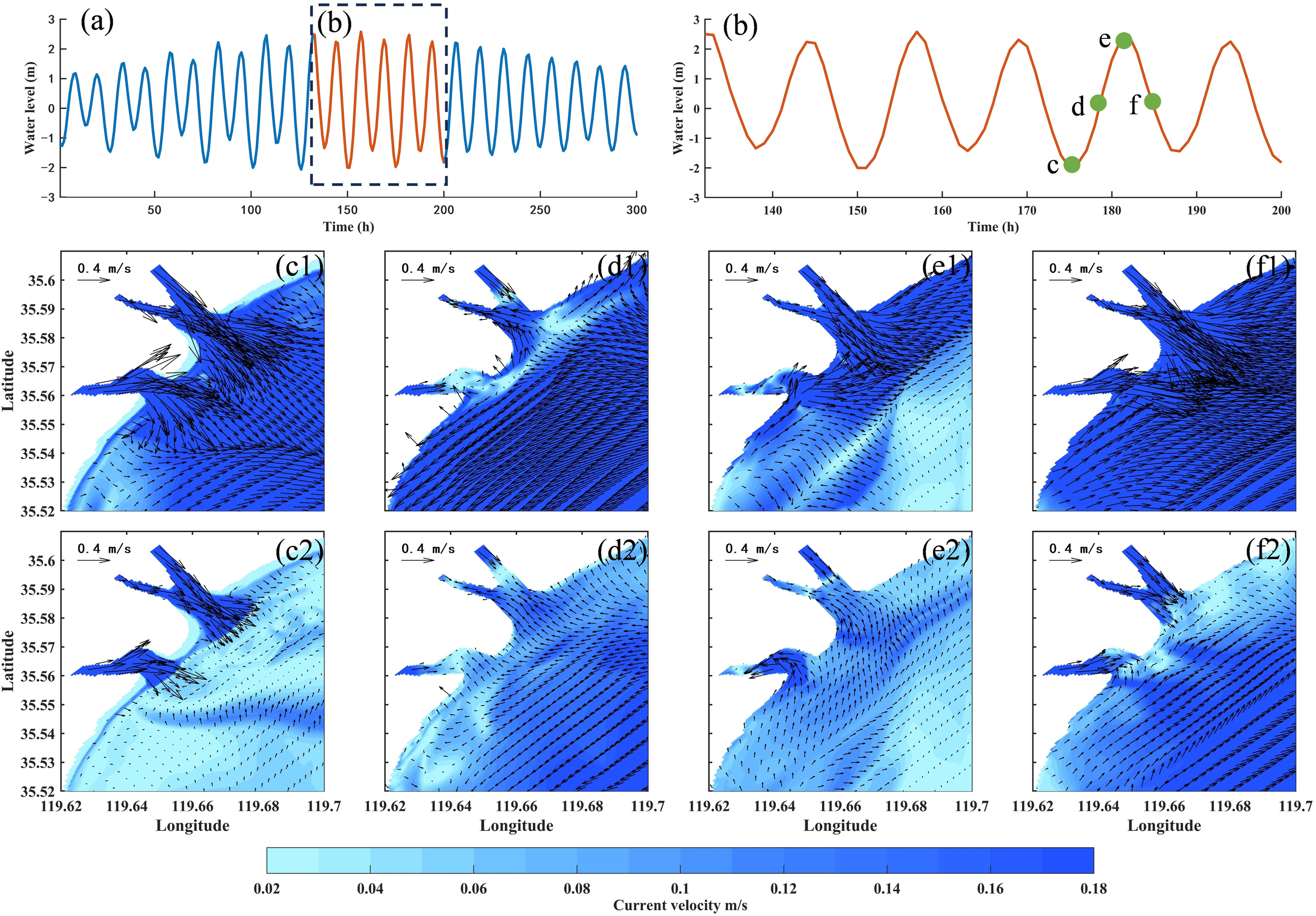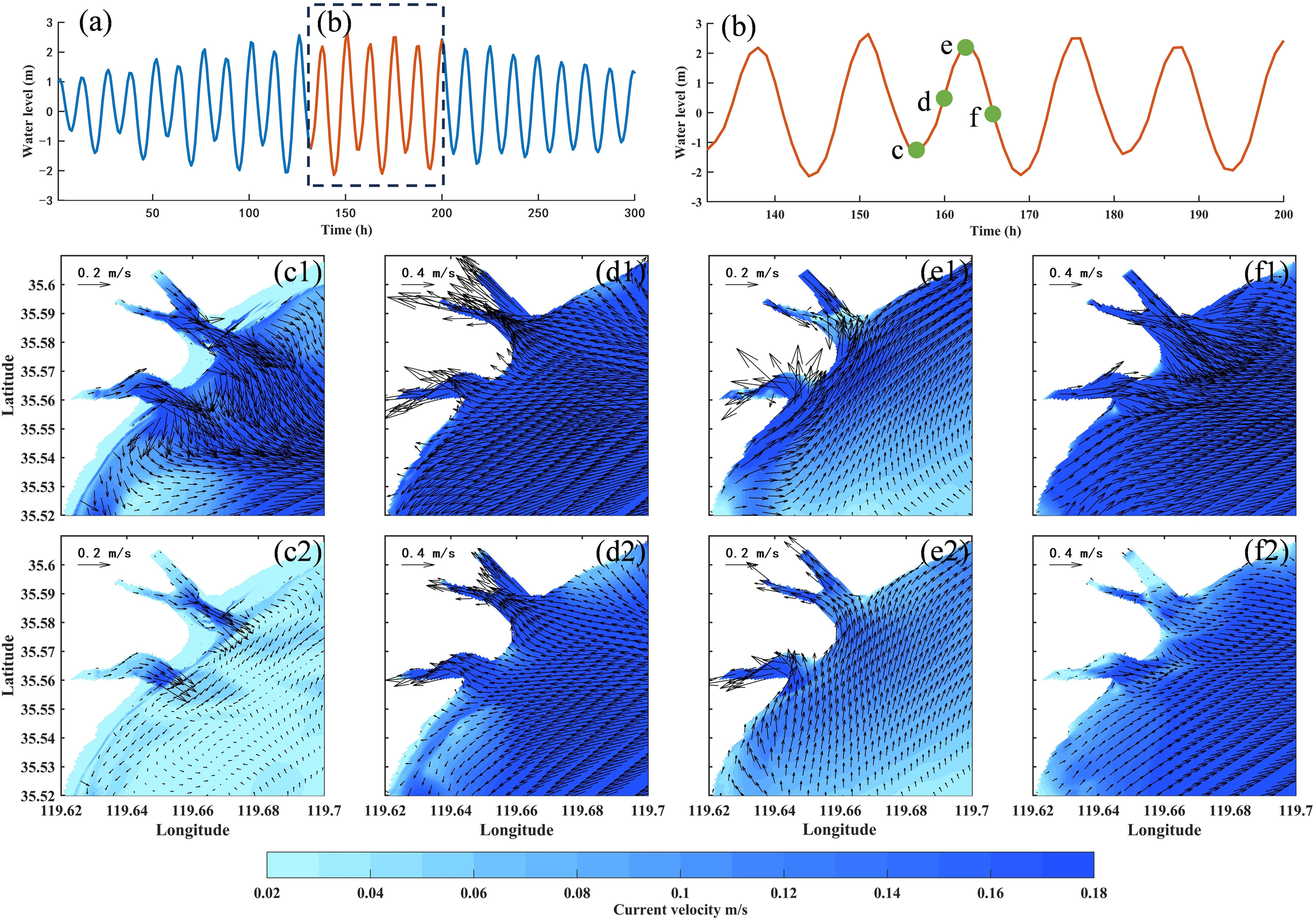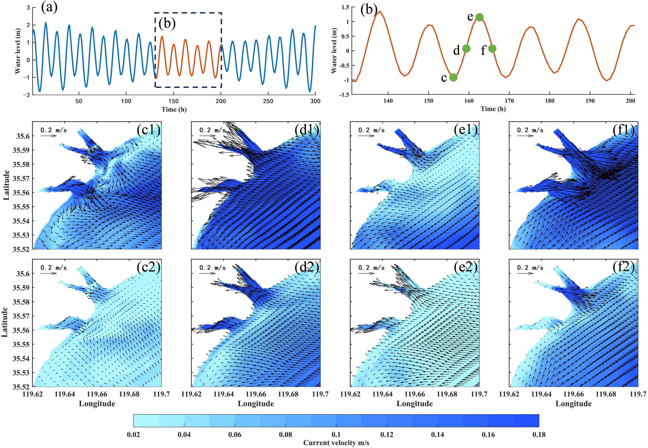 Distribution diagram of neap tide flow field in winter of wet year. (a, b) are water level diagrams; (c–f) respectively show the flow field distributions during slack at ebb tide, peak flood tide, slack at flood tide, and peak ebb tide; number 1 represents the surface flow field, number 2 represents the bottom flow field.