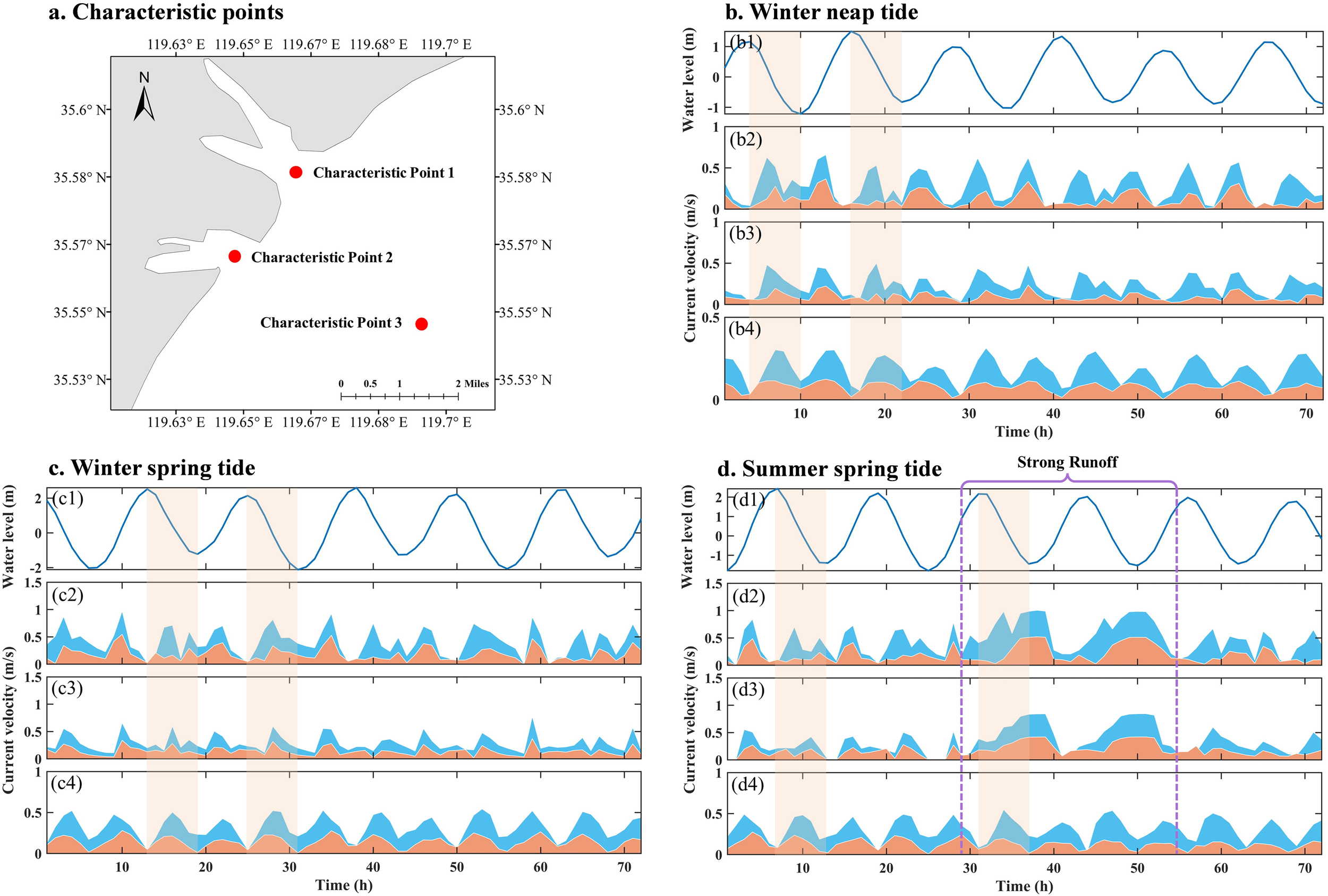 (a) Location of characteristic points. (b) Current velocity distribution of characteristic points during winter neap tide: (b1) water level, (b2) velocity at point 1, (b3) velocity at point 2 and (b4) velocity at point 3. The blue fill indicates the surface velocity, while the orange fill indicates the bottom velocity. The orange shading corresponds to the part of ebb-tide process. (c) Current velocity distribution of characteristic points during winter spring tide. (d) Current velocity distribution of characteristic points during summer spring tide. The purple dashed line represents the strong runoff process.