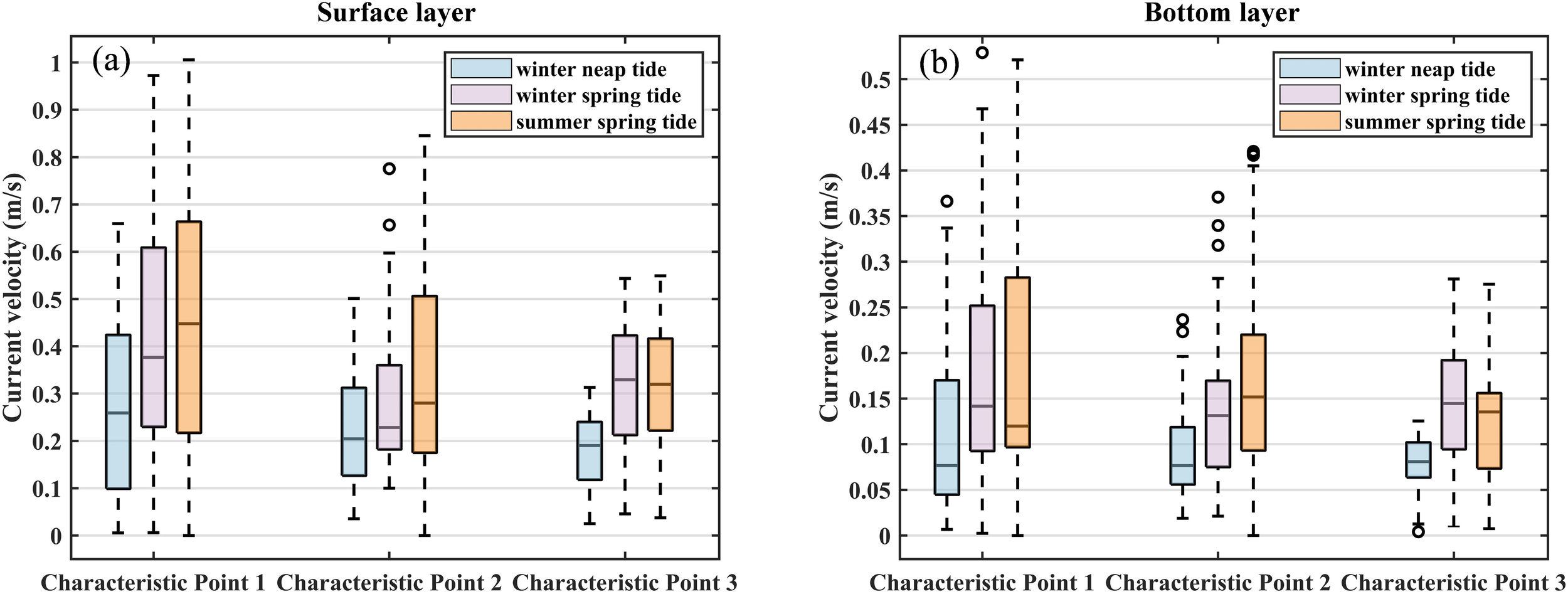 Velocity box plot of each point. (a) surface layer, (b) bottom layer. Blue represents winter neap tide, pink represents winter spring tide, and orange represents summer neap tide (time period: 72 hours).