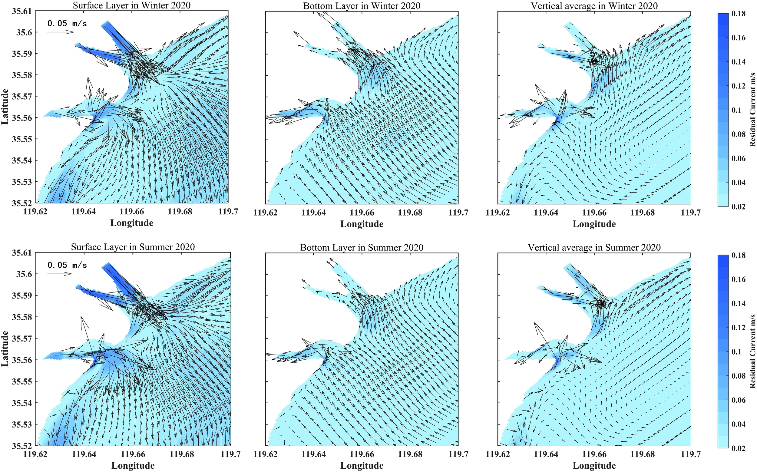Distribution diagram of seasonal average residual current in wet year. The first row shows the distribution of surface, bottom and vertical average residual current in winter; the second row shows the distribution of surface, bottom and vertical average residual current in summer.