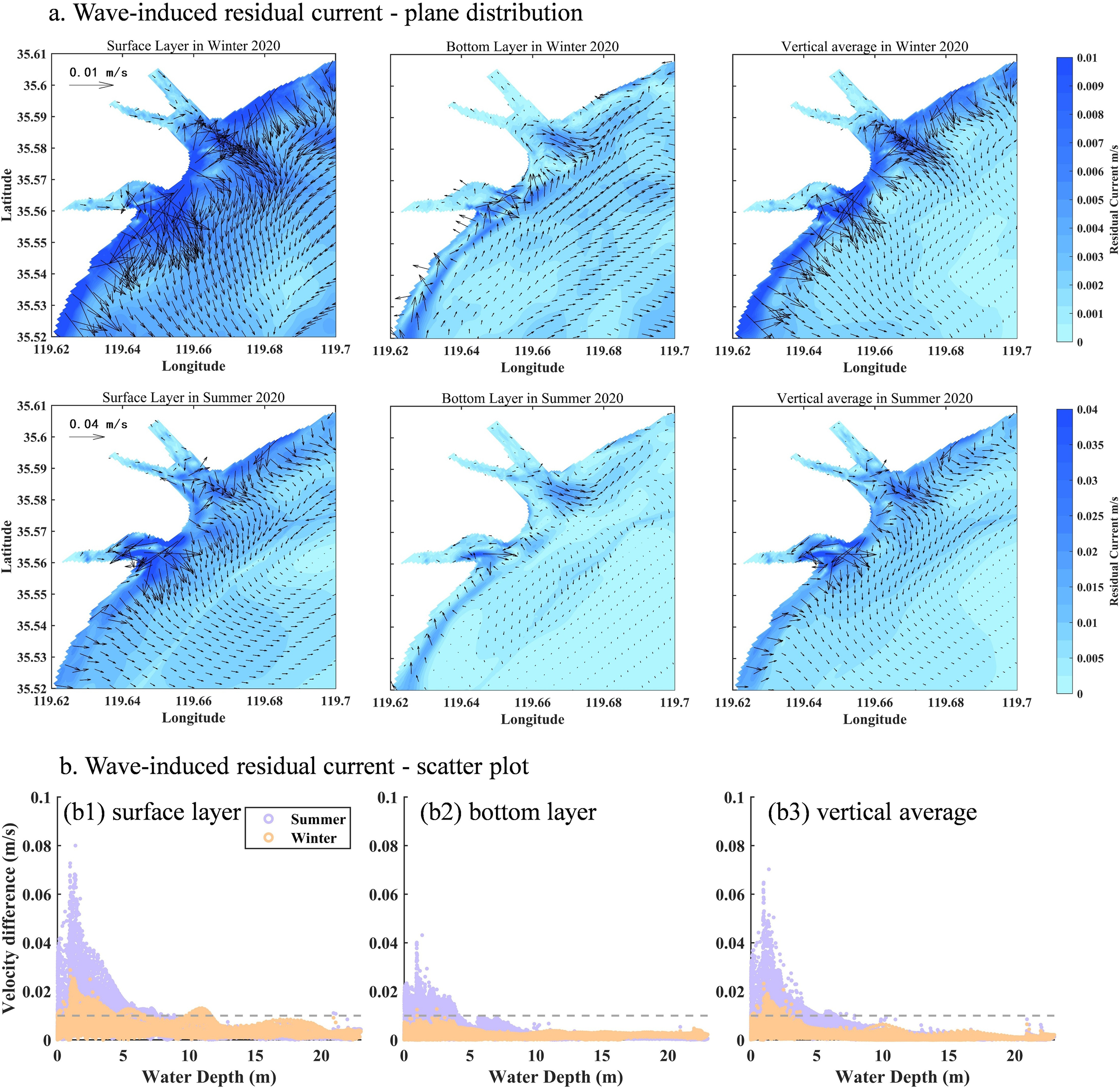 (a) The difference diagram of seasonal average wave-induced residual flow in wet year. The first row shows the difference distribution of surface, bottom and vertical average residual flow in winter; the second row shows the difference distribution of surface, bottom and vertical average residual flow in summer. (b) Scatter plot of wave-induced residual current and water depth in the study area. Purple scatter plots are summer, and orange scatter plots are winter.