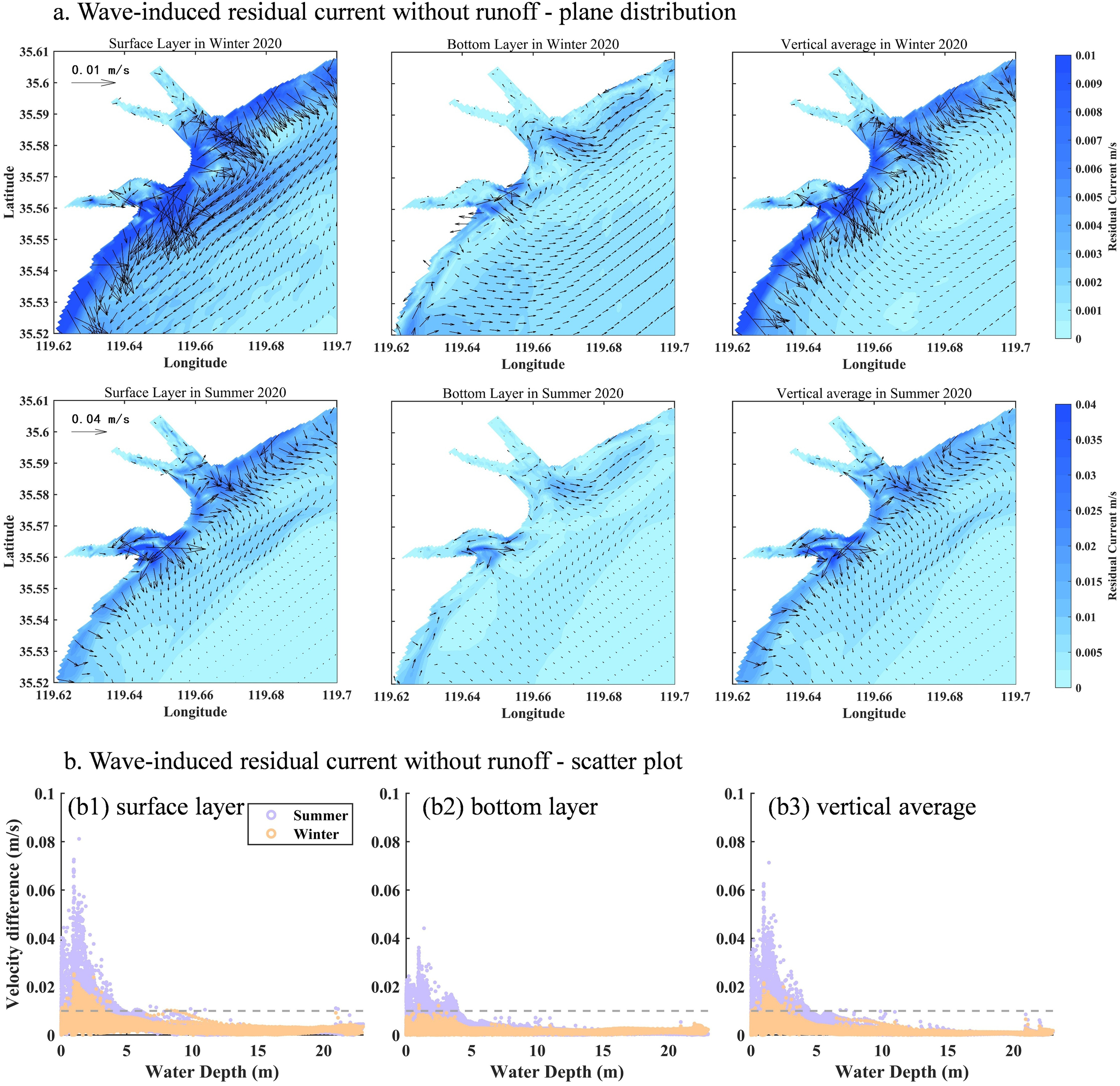 (a) The difference diagram of seasonal average wave-induced residual flow in wet year without runoff. The first row shows the difference distribution of surface, bottom and vertical average residual flow in winter; the second row shows the difference distribution of surface, bottom and vertical average residual flow in summer. (b) Scatter plot of wave-induced residual current without runoff and water depth in the study area. Purple scatter plots are summer, and orange scatter plots are winter.