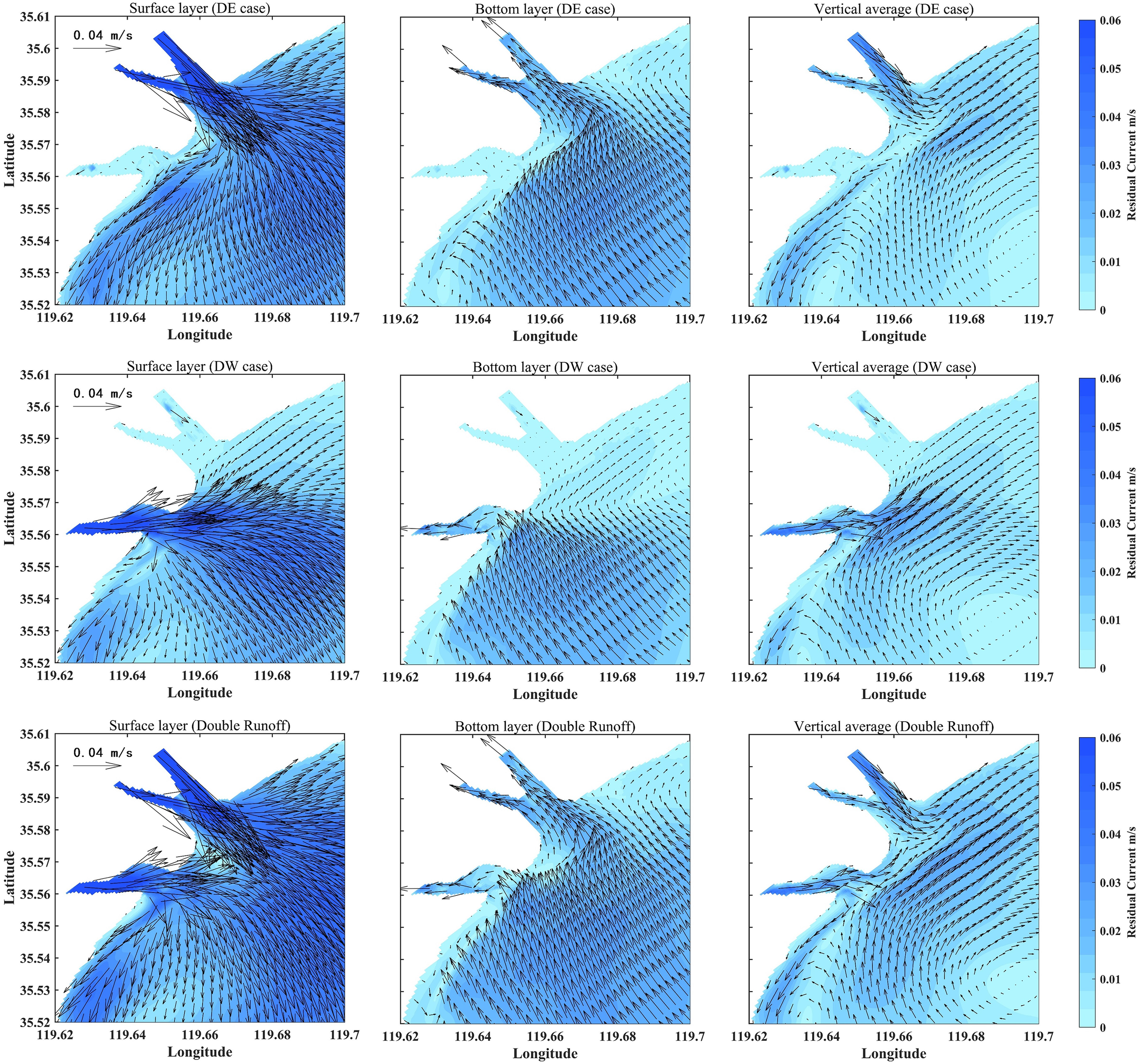 When runoff is introduced exclusively from the southern estuary, the zone of maximum enhancement in residual currents remains centered along the channel and jet axis (Figure 12, DW case). However, its hydrodynamic characteristics are significantly different from the DE case. Due to the small angle between the jet axis and the shoreline, along with the narrow channel and irregular coastline, the generated alongshore currents are weak. The impact of the DW case on the alongshore residual currents on both sides of the estuary is substantially weaker than that of the DE case, especially in the northeastern area. In terms of vertical structure, runoff induces a landward compensation flow in the bottom layer, with high-value zones primarily located in the southwestern area, corresponding spatially to the surface layer. Vertically averaged residual currents show a clear seaward transport pattern in the southern estuary, although the velocity is high only near the estuary, with generally low velocities elsewhere. This spatial pattern highlights the critical role of local topographic constraints in shaping the runoff-driven hydrodynamics in the southern estuary.