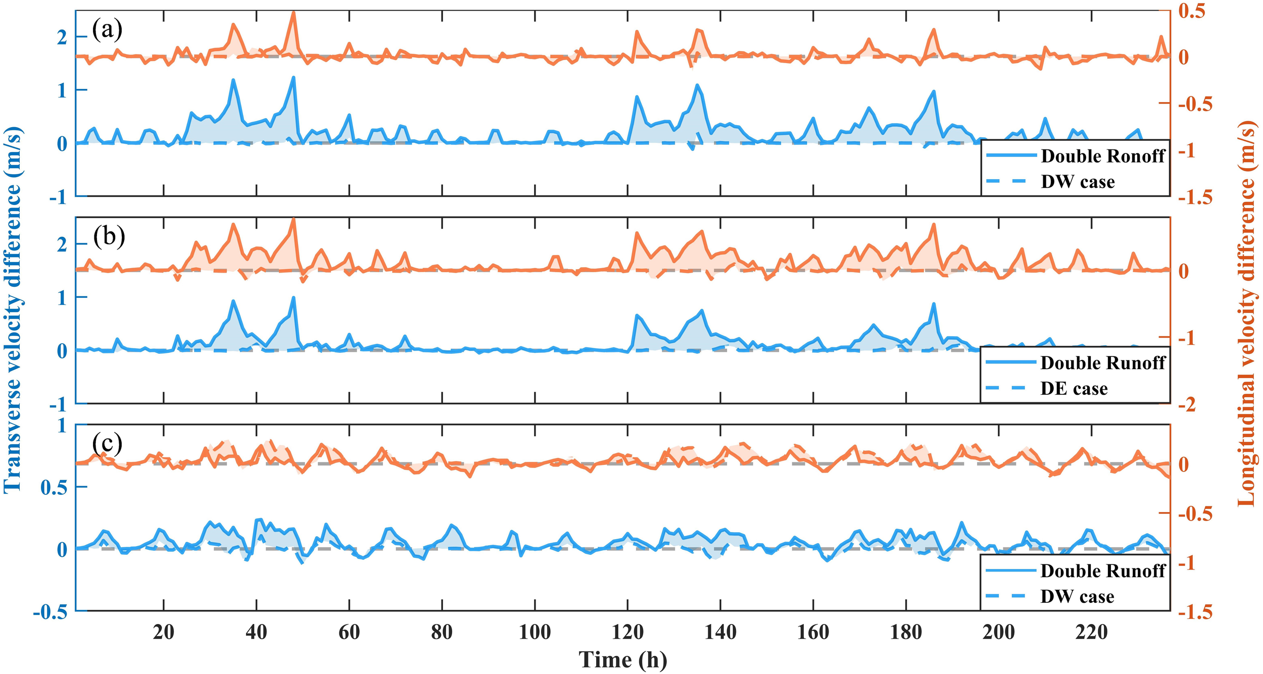 The results indicate that the hydrodynamic characteristics of the study area are significantly influenced by runoff and waves. Accordingly, this section presents a series of numerical experiments to systematically investigate the mechanisms through which wave-runoff interactions affect estuarine hydrodynamics.
