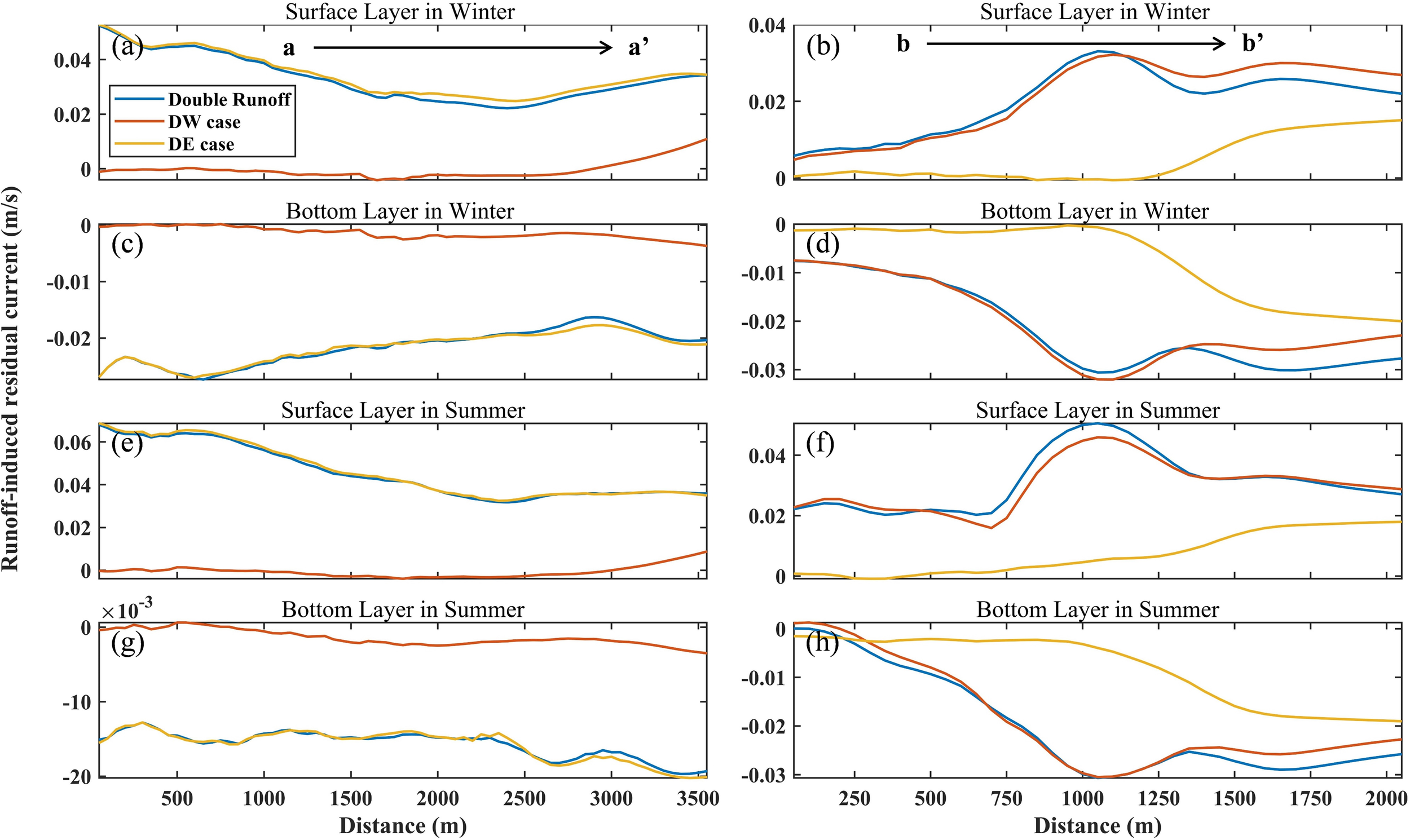 In summary, the impact of waves on the residual currents in the study area is primarily concentrated in the nearshore areas and gradually weakens offshore. In the wet year, the intensity of wave-induced residual currents in summer is approximately four times that in winter, which is directly attributed to stronger wave forcing during the summer. Moreover, a velocity discontinuity emerges near the 6 m isobath due to wave breaking. Comparative experimental results indicate that the addition of runoff significantly enhances wave-induced residual current. In the absence of runoff, the intensity of wave-induced residual currents decreases markedly throughout the entire study area.