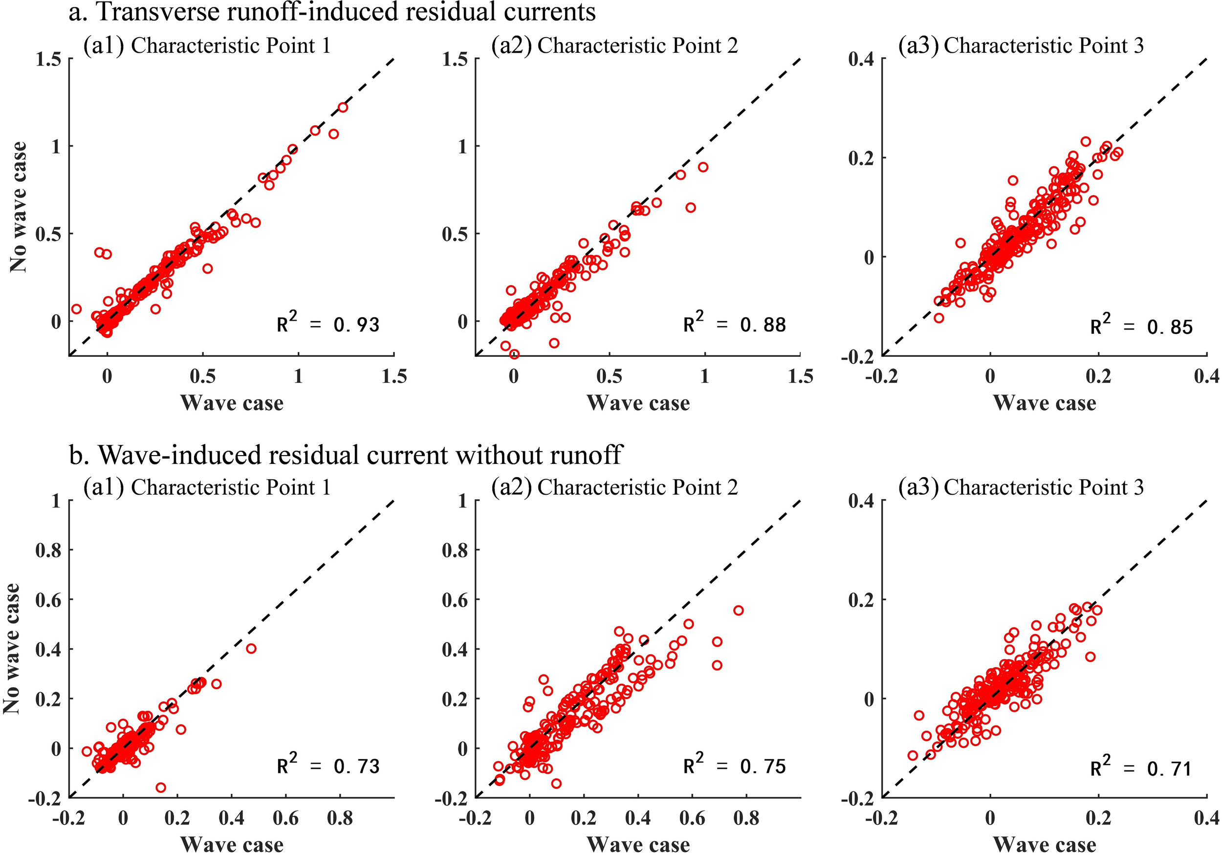 During high-runoff conditions in summer, the removal of runoff leads to a substantial reduction in wave-induced residual currents across the study area. The surface current direction remains seaward, but the high-value zones near both estuaries contract, with a more pronounced decrease around the southern estuary. The most significant reductions occur within the 0 ∼ 5 m depth range, where the number of data points with velocities between 0.01 and 0.04 m/s drops sharply (Figure 11b1). In addition, the surface wave-induced residual current beyond the 6m isobath decreases from 0.015 m/s to 0.002 m/s, and the current direction shifts from southward to southwestward, highlighting the essential role of runoff in sustaining offshore-directed residual currents. Compared to the surface layer, the response of bottom wave-induced residual currents to runoff changes is relatively weak, with reductions mainly concentrated in the nearshore areas and smaller velocity attenuation than that at the surface.