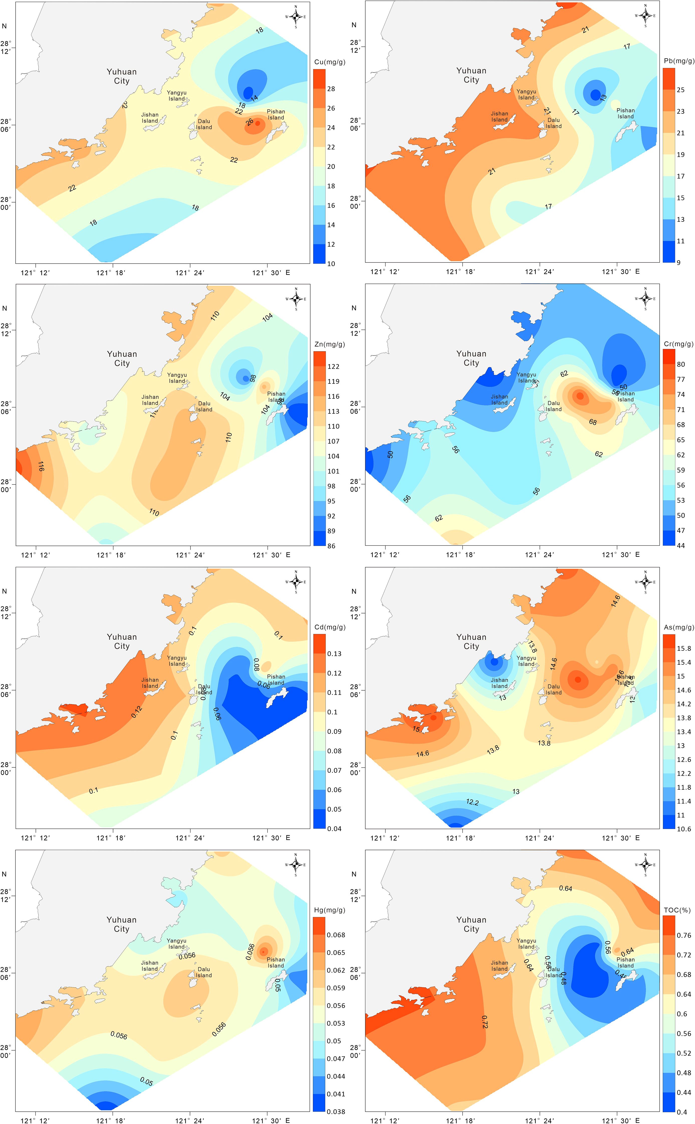 Spatial distribution of HMs in surface sediments is depicted in Figure 2. With the exception of Cr, both heavy metals and total organic carbon (TOC) showed a cross-shelf gradient with higher concentrations inshore and lower values offshore. Pronounced enrichment was detected in localized zones, particularly near Pishan Island and Dalu Island. In contrast, elevated Cr levels were largely confined to the region between Pishan Island and Dalu Island.