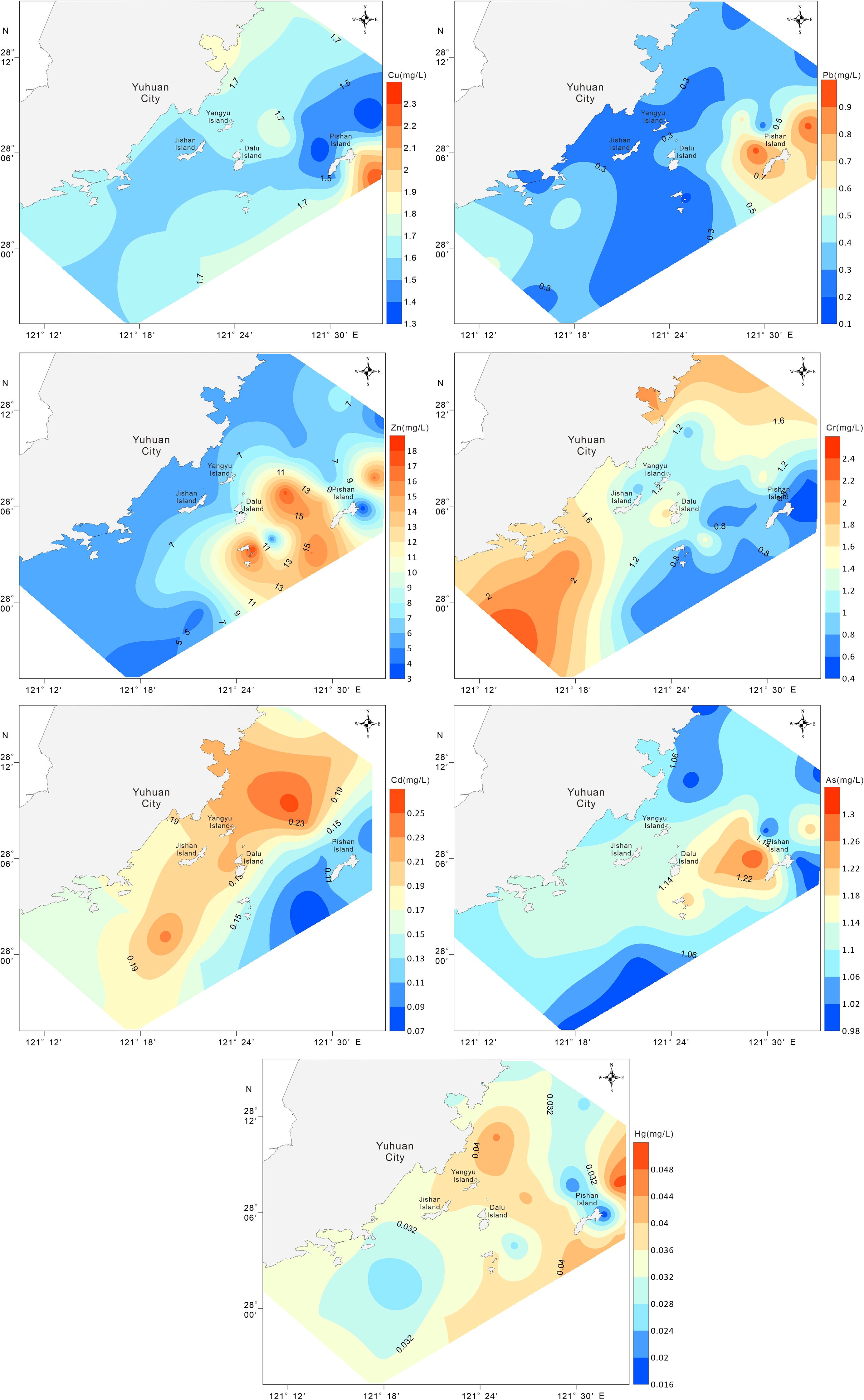 In the water column, dissolved metal concentrations (in μg/L) ranged as follows: Cu (1.3–2.3), Pb (0.19–0.95), Zn (3.1–18.0), Cr (0.4–2.3), Cd (0.07–0.26), As (1.0–1.3), and Hg (0.017–0.05). Their mean values were 1.64, 0.41, 8.07, 1.35, 0.17, 1.10, and 0.03 μg/L, respectively. All values met the Class I requirements of the Seawater Quality Standard (GB 3097–1997).